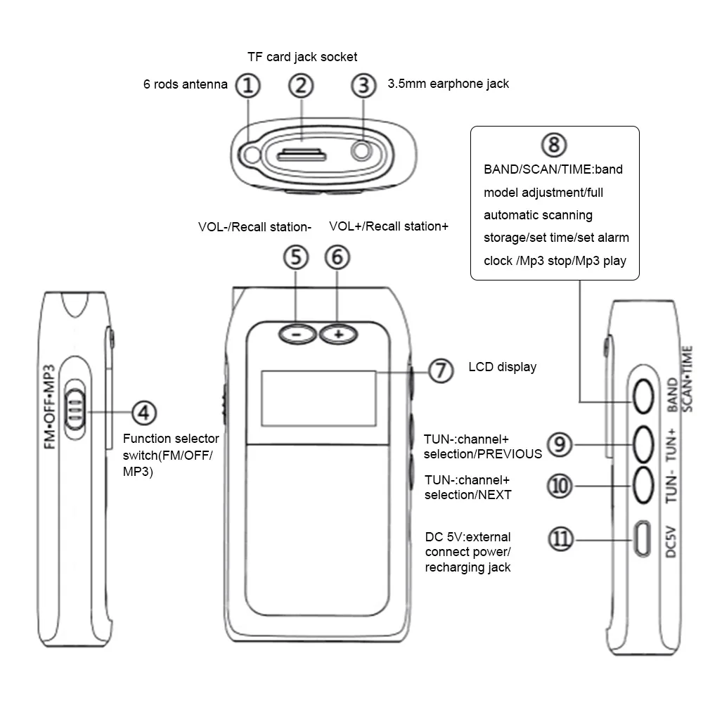 Радио компактно и легко переносится, со встроенной литиевой батареей емкостью 500 мАч для зарядки через USB. Различные режимы можно поддерживать в небольшом корпусе. Карманный mp3-плеер/MW / SW/Стерео FM цифровое радио, это HIFI звук. Это принесет вам различные типы слуха. С 1,18 дюйма ЖК-дисплей цифровым дисплеем, он также поддерживает MP3/WAV формат воспроизведения.