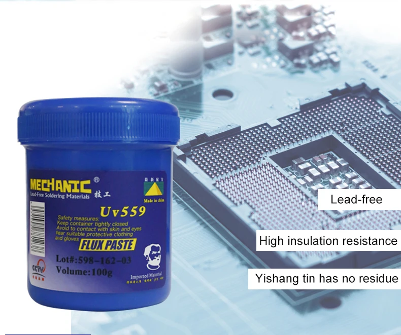 -Тип: 559/223 паяльная паста -Объем: 100 г/10 мл -Размер: 97*30 мм (10 мл)/79*59 мм (100 г) -Отличный паяльный рабочий инструмент для смартфонов, печатных плат, BGA, электронных деталей-ремонта. -Бессвинцовая Защита окружающей среды, легко жестяная, без остатка, высокая теплостойкость -Мягкий рН, отсутствие коррозии к IC или PCB. -Прозрачный остаток, стирка не требуется. -Температура плавления немного выше, чем паяльник.