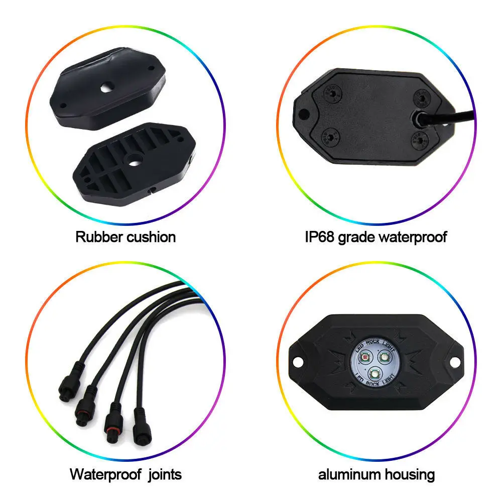 Пройдя сертификацию CE и достигнув водонепроницаемого стандарта IP68, прочные алюминиевые строительные рок-светильники с закаленным стеклом, которые делают эти огни очень устойчивыми к ударам. Шнуры изготовлены из высококачественного материала длиной 135,8 дюйма, достаточно длинны для различных целей. Возможности бесконечны!