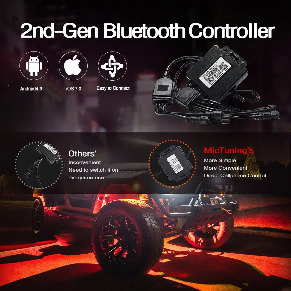Микротюнинг RGB рок-светильник, состоящий из 16 миллионов цветов RGB, Функция синхронизации, режим музыки и управление Bluetooth, может использоваться как рок-светильник s, аварийный светильник s, И действительно о чем-то другом вы можете подумать, когда вам нужен светильник RGB, работающий на вашем автомобиле. Но он используется не только для транспортных средств, но и для внутреннего светильник, купольный светильник, неоновый светильник светодиодный, светильник яхты и т. Д. Если вы собираетесь провести музыкальные вечерние, танцевальные вечерние, яхт-клуб, кинофестиваль, ежегодную встречу, фестиваль ночных гонок, Тогда светильник Mictuning rock-ваш лучший выбор, который делает его потрясающим!