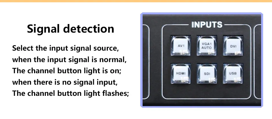 ● Поддержка usb-плеера ● Поддерживает аудиовыход синхронизации звука Плавно Переключайте любой канал Функция обнаружения сигнала Высшее разрешение: 1920*1080 при 60 Гц ► 5-канальный аналогово-цифровой видео Вход: 1 HDMI, 1 HDMI, DVI, 1 VGA, 1 AV 、 1 взаимный обмен данными между компьютером и периферийными устройствами 、 (Опционально: 1 WIFI, 1 SDI) ● 2-канальный цифровой видеовыход: 2 DVI ● Настройки быстрой регулировки ручки ● Поддержка входного сигнала SDI и петли SDI ► Одним нажатием кнопки черный или замораживания Функция блокировки ключа → 10 режимов сохранены и отозваны