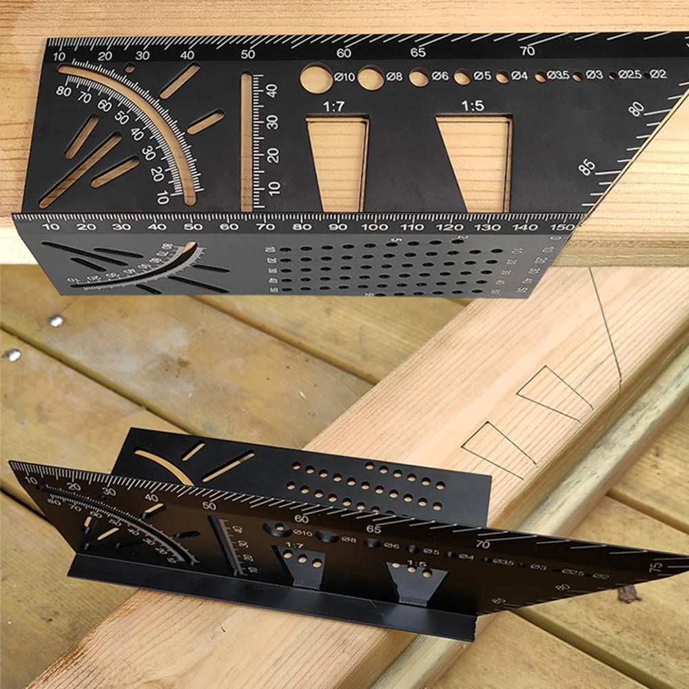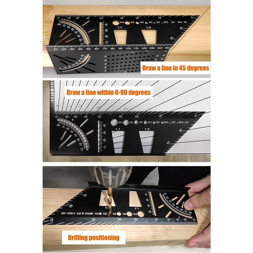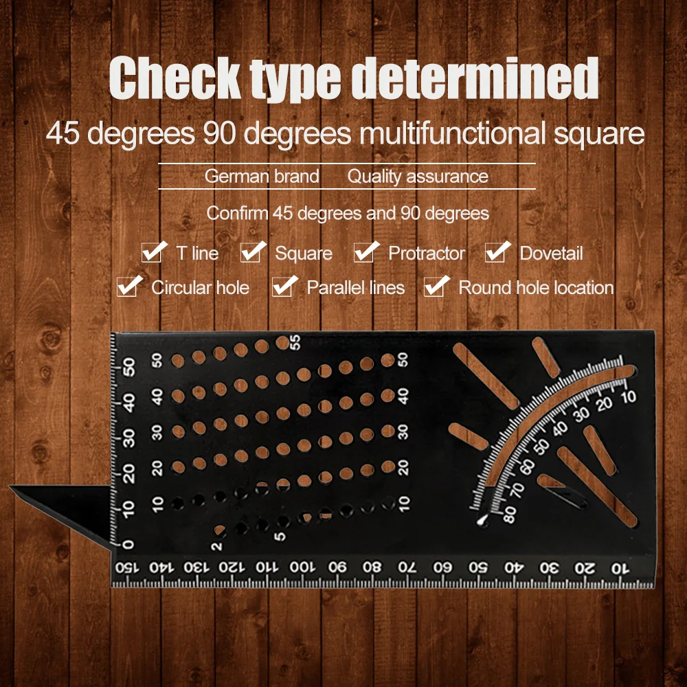 Многофункциональный угловой квадрат портативный по размеру и весу. Многофункциональность, поддержка линий, штамповка и измерение угла. Превосходный материал из алюминиевого сплава, нержавеющий, водонепроницаемый, фрикционный и прочный. Подходит для резки и маркировки различных материалов. Точный угол, стерео моделирование прост в использовании.