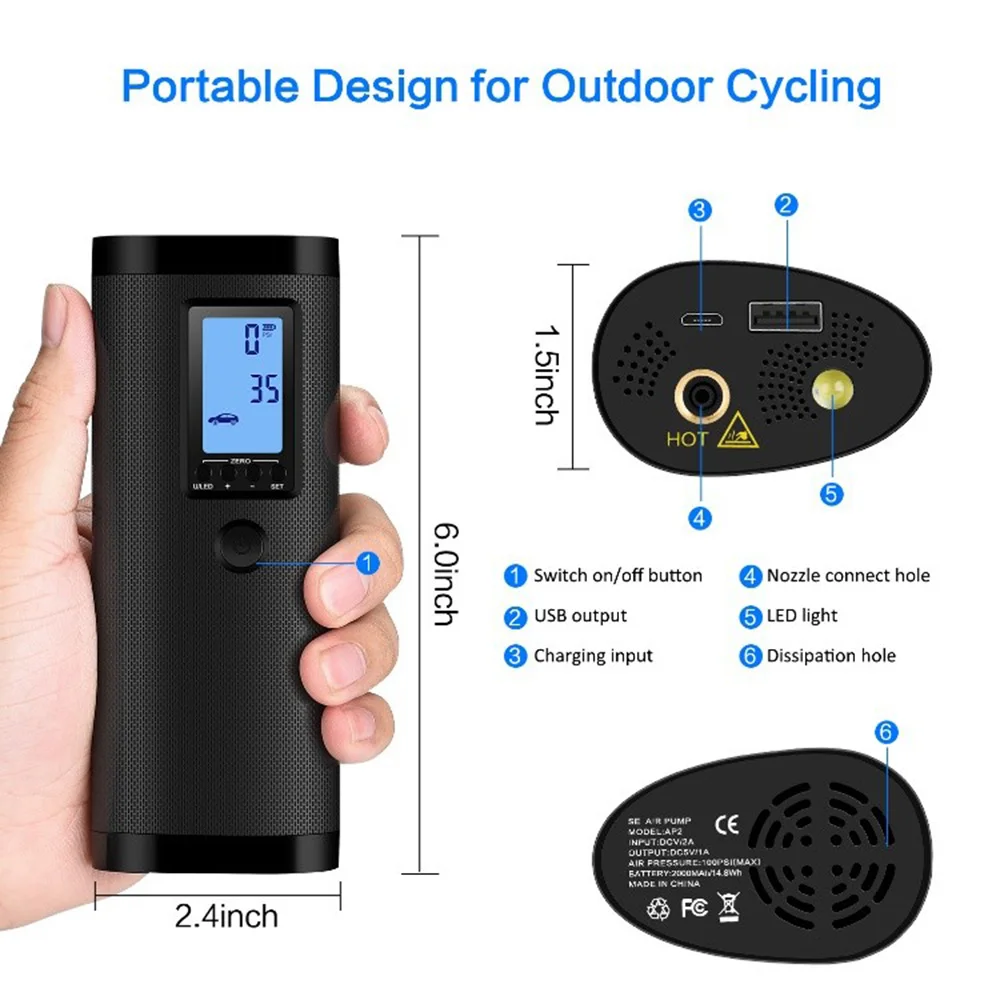 Воздушный насос портативный по размеру и весу, удобно носить с собой и хранить. ЖК-цифровой дисплей. Интеллектуальный надувной режим. Человеческий дизайн, ручной портативный надувной. Многофункциональный, может использоваться в качестве заряда pal, вспышки. Четыре степени защиты, защита от перетока, ударов, перенапряжения и ожогов. Встроенная ячейка большой емкости обеспечивает длительное время работы.