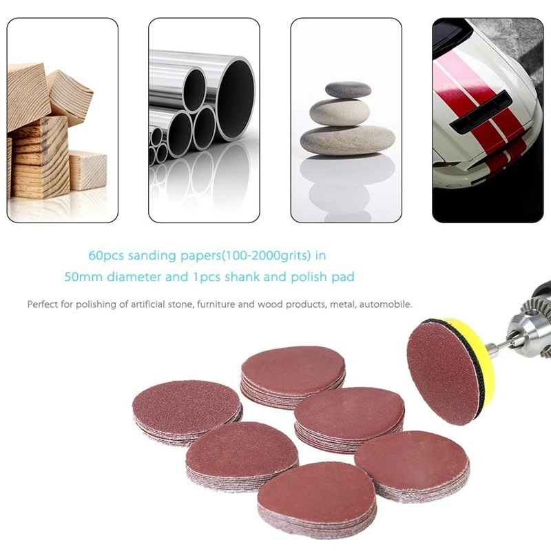 1. включая 60 s наждачную бумагу (100-2000 гритов) в диаметре 50 мм и 1 шт. вал и полировка pad.2.идеально подходит для полировки искусственного камня, мебели и изделий из дерева, металла, автомобилей. 3.подходит для сглаживания внутри и снаружи изогнутых краев, для подготовки поверхности и для большинства электрических песочников.