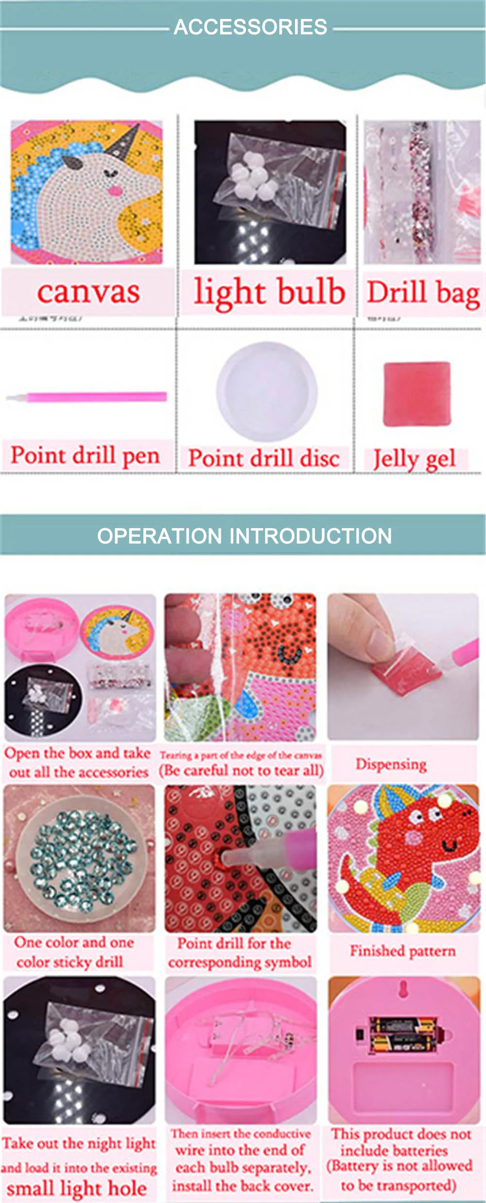 1. Откройте пакет и выньте все аксессуары; 2. Снимите некоторые края холста, не отрывайте их всех; 3. Используйте точечное сверло для захвата пектина; 4. Поместите алмаз в точечный сверлильный диск; 5. Сверло на символе над холстом; 6. Повторите шаги до завершения всей картины; 7. Выньте Ночной свет и поместите его в маленькое световое отверстие; 8. Вставьте провод в конец каждой лампы и Установите заднюю крышку; 9. Наконец-то Установите 2 батарейки типа АА;
