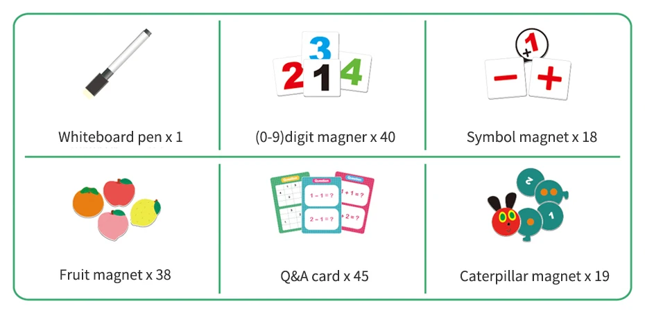 Ручка для белой доски x 1 (0-9) цифра магнит x 40 символ магнит x 18 фруктовый магнит x 38 Q и карта x 45 магнит для гусеницы x 19