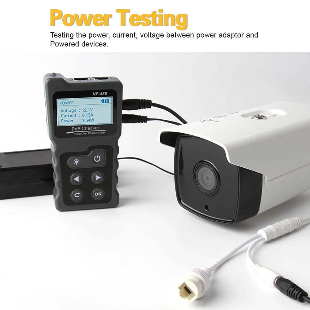 NF-488 проверки PoE состоит из двух частей: излучателя и пульта дистанционного управления. Он имеет функции, такие как стандартное и нестандартное обнаружение оборудования PoE, онлайн-тест питания PoE, тест на непрерывность сетевого кабеля, тест на питание постоянного тока, циклический тест переключателя и другие функции. Таким образом, он идеально подходит для мониторинга безопасности, проводов связи, интегрированной проводки и других слабых систем тока.