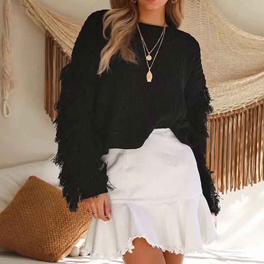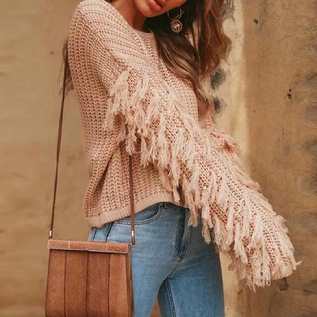 Женский Повседневный однотонный пуловер с круглым вырезом и кисточками, свободные свитера с длинными рукавами, топы