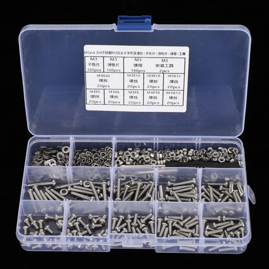 662 шт./компл. винты из нержавеющей стали M3 Pan машина винт + плоская/эластичная шайба + гайка Аппаратные части tornillos cabeza