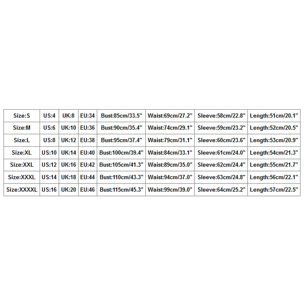 Размер: SСША: 4Великобритания: 8ЕС: 34Бюст: 85 см/33,5"Талия: 69 см/27,2"Рукав: 58 см/22,8"Длина: 51 см/20,1"Размер: MСША: 6Великобритания: 10ЕС: 36Бюст: 90 см/35,4"Талия: 74 см/29,1"Рукав: 59 см/23,2"Длина: 52 см/20,5 дюймаРазмер: LСША: 8Великобритания: 12ЕС: 38Бюст: 95 см/37,4"Талия: 79 см/31,1"Рукав: 60 см/23,6"Длина: 53 см/20,9"Размер: XLСША: 10Великобритания: 14ЕС: 40Бюст: 100 см/39,4"Талия: 84 см/33,1"Рукав: 61 см/24,0"Длина: 54 см/21,3"Размер: XXLСША: 12Великобритания: 16ЕС: 42Бюст: 105 см/41,3"Талия: 89 см/35,0"Рукав: 62 см/24,4"Длина: 55 см/21,7"Размер: XXXLСША: 14Великобритания: 18ЕС: 44Бюст: 110 см/43,3"Талия: 94 см/37,0"Рукав: 63 см/24,8"Длина: 56 см/22,1"Размер: XXXXLСША: 16Великобритания: 20ЕС: 46Бюст: 115 см/45,3"Талия: 99 см/39,0"Рукав: 64 см/25,2"Длина: 57 см/22,5 дюйма