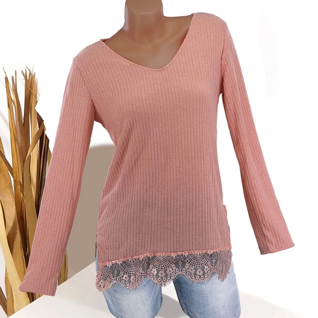 Женская Повседневная кружевная блузка с v-образным вырезом и длинным рукавом, милый пуловер, свитера, Рубашки, Топы