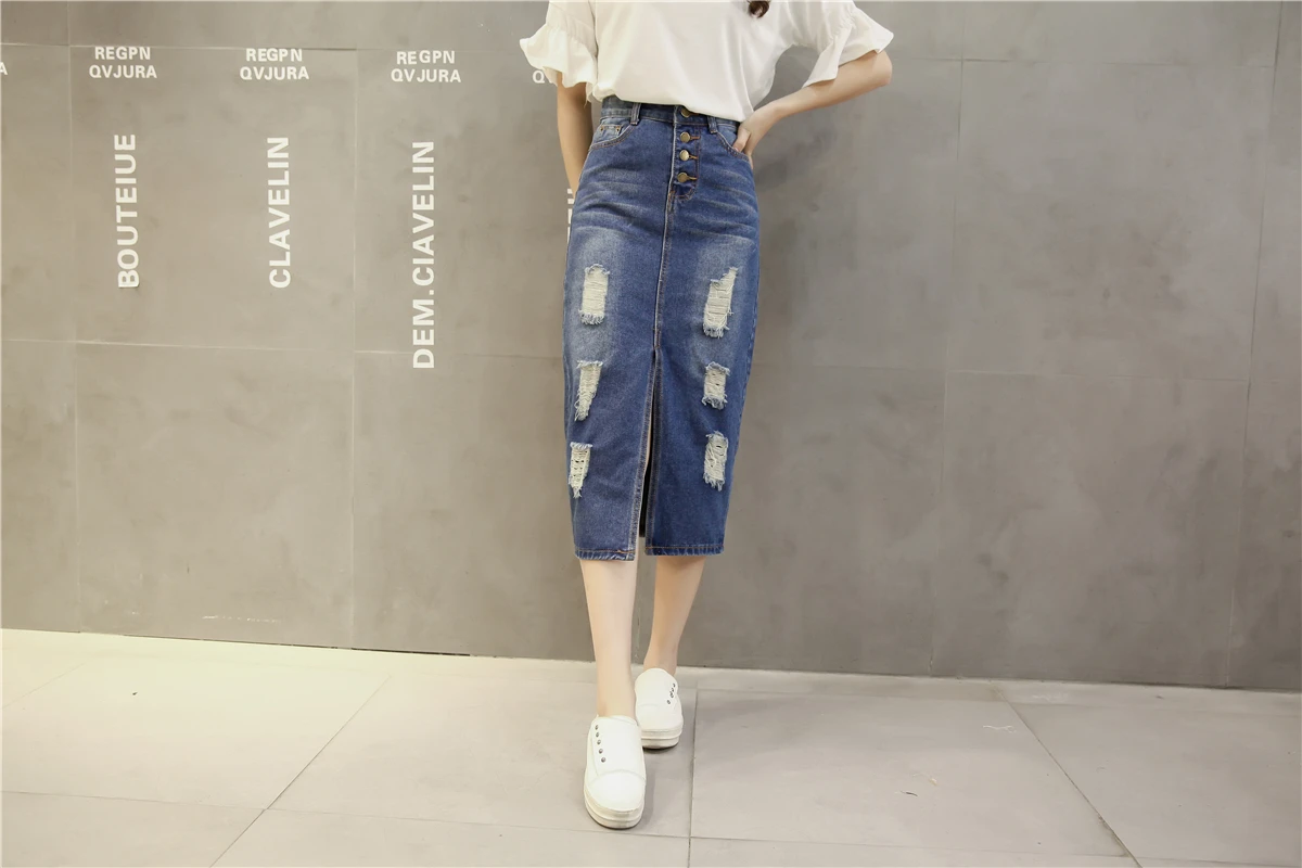2019 New Spring Summer Autumn fashion women long denim skirt Vintage maxi skirts hole jeans pencil skirts RQ360<