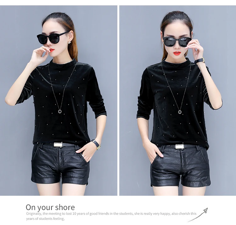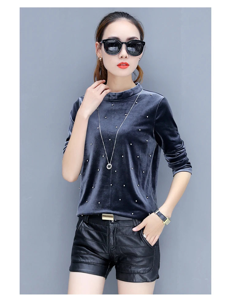 Harajuku women t-shirt slim long sleeve stand collar velvet t shirt female tops plus size 3XL fashion beaded velour tshirt E384<