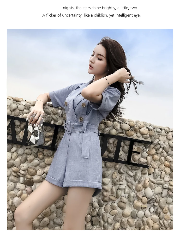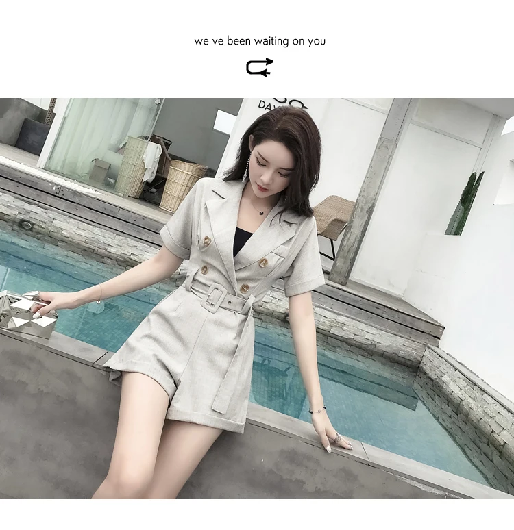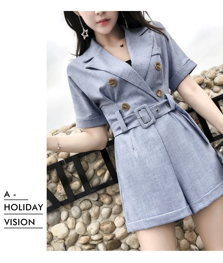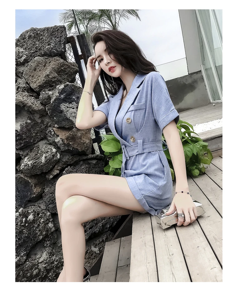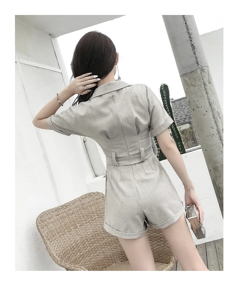 Офисные женские хлопковые и льняные блейзеры, Дизайнерские летние женские комбинезоны с коротким рукавом, комбинезоны с поясом, широкий воротник, RQ438 <