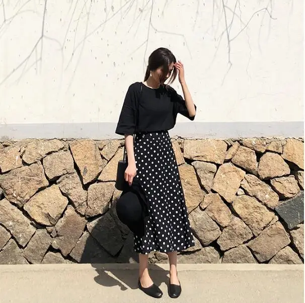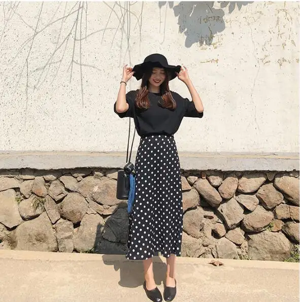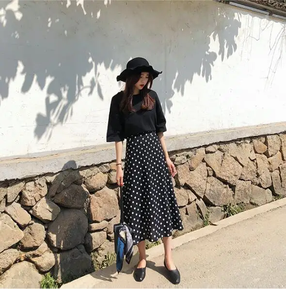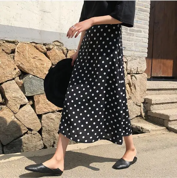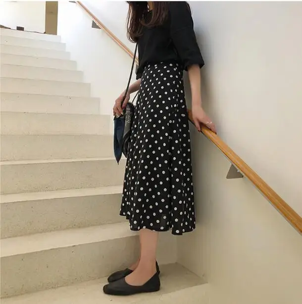 2019 летняя длинная юбка женская в Корейском стиле винтажная в горошек тонкая высокая талия A Line черная Шифоновая Юбка saia longa LJ209 Измерение: (Единица измерения: см) Размер Обхват талии Длина S 32 77 М 34 78 L 36 79 XL 38 80