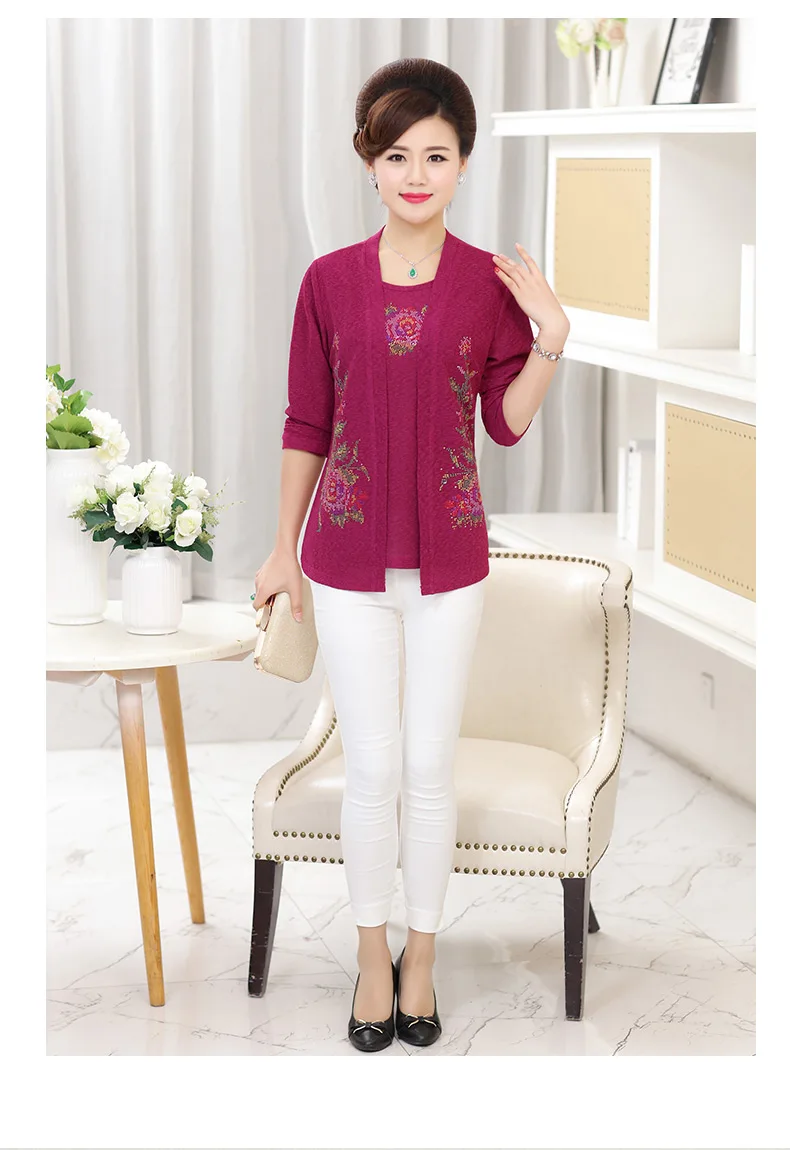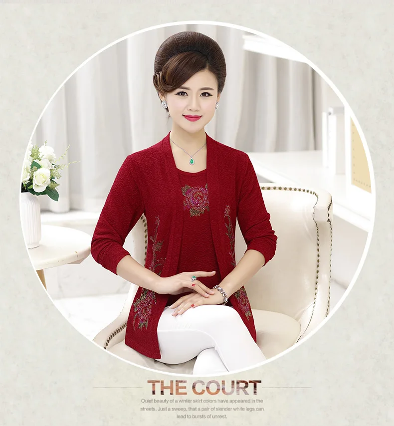 Имитация двух частей футболка с длинными рукавами весна осень новая одежда для мамы среднего возраста алмаз плюс размер Женский Топ пуловер DV132
