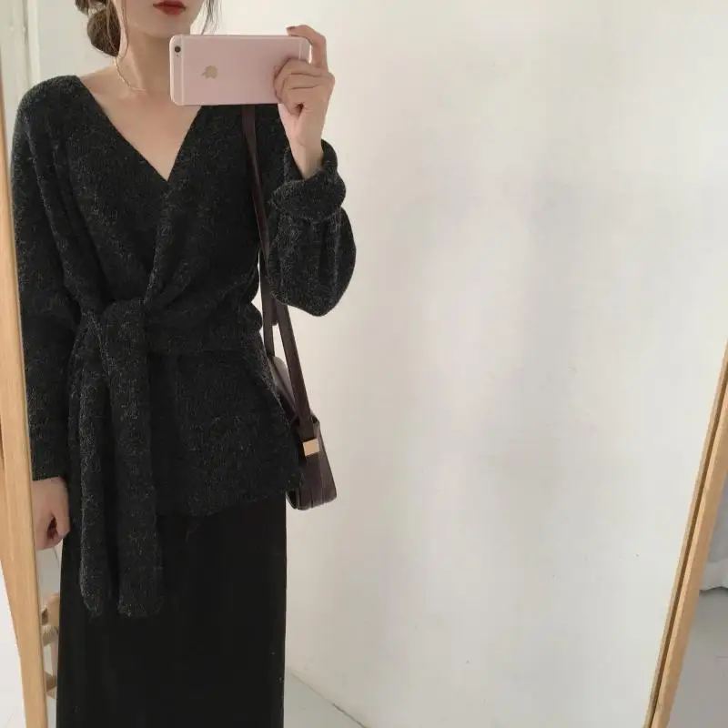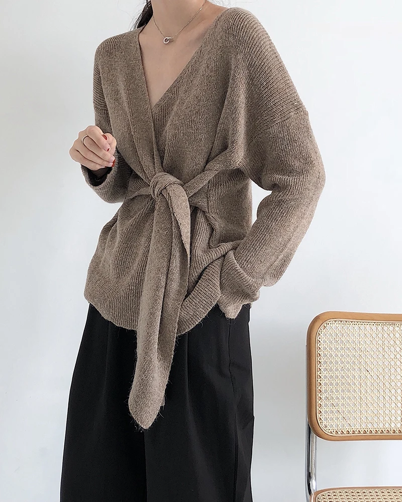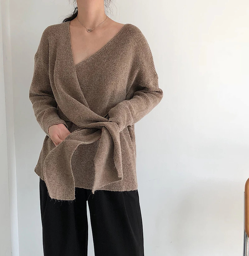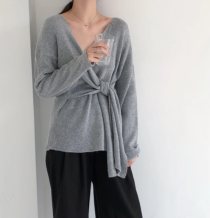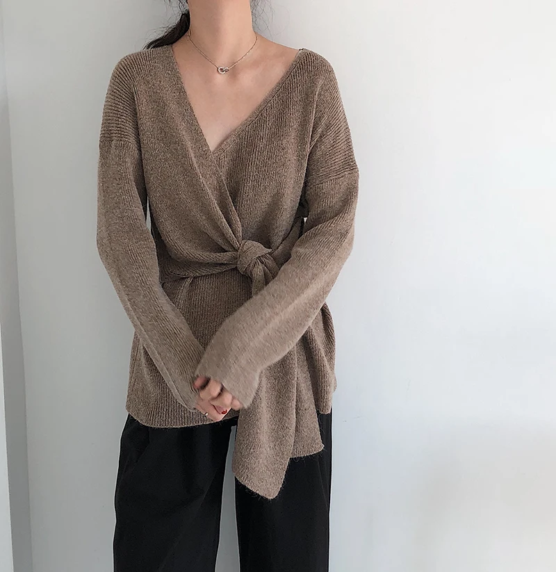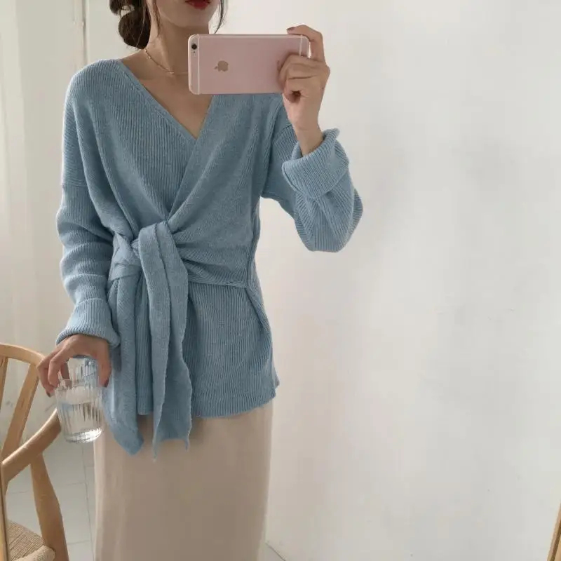 Женский свитер в Корейском стиле со шнуровкой на талии, женские свитера, однотонный необычный Sueter Mujer, повседневный вязаный свитер с v-образным вырезом, LJ345 Измерение: (Единица измерения: см)