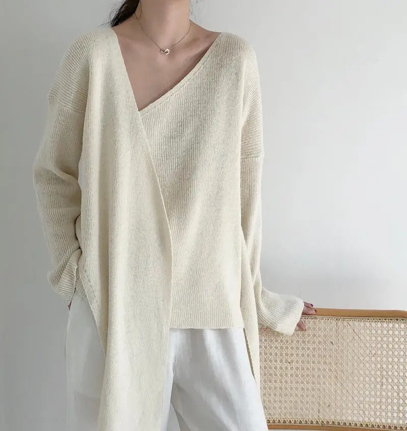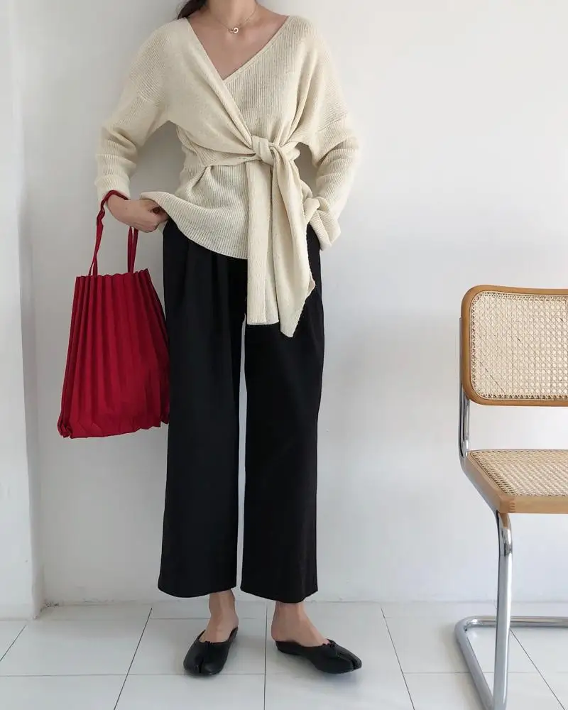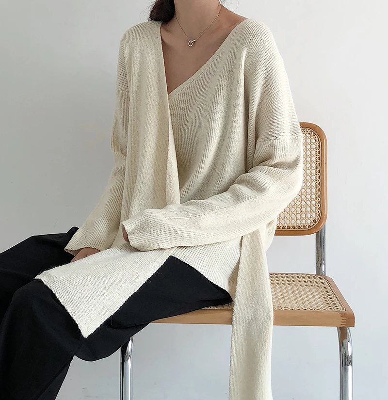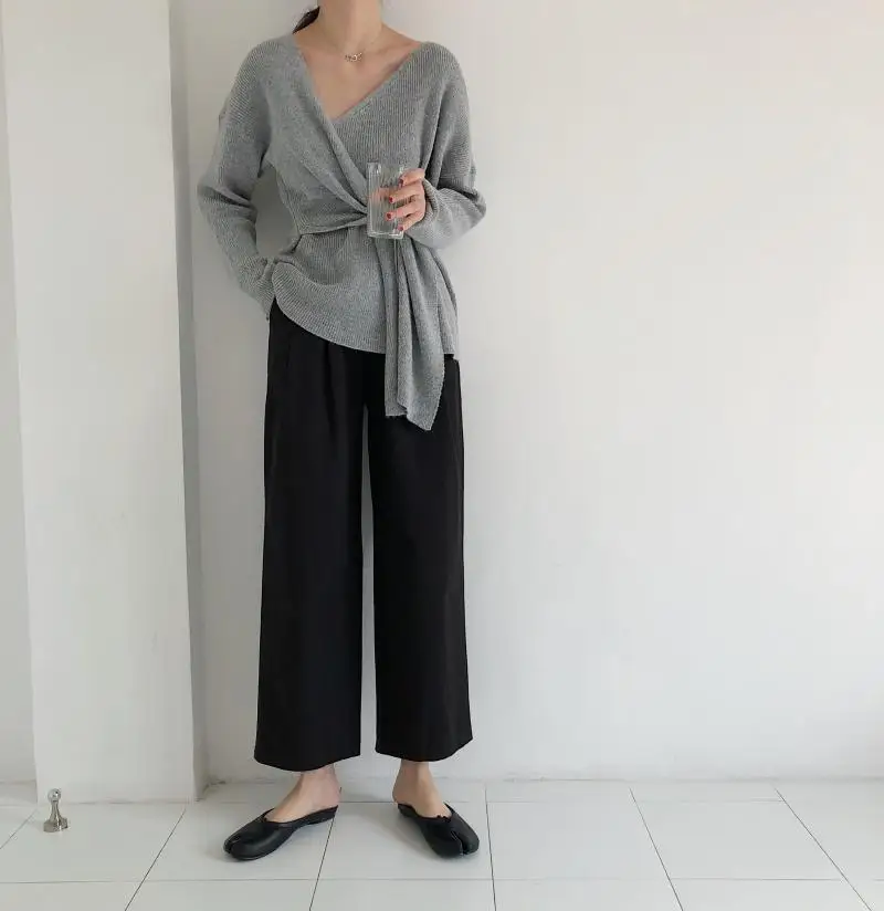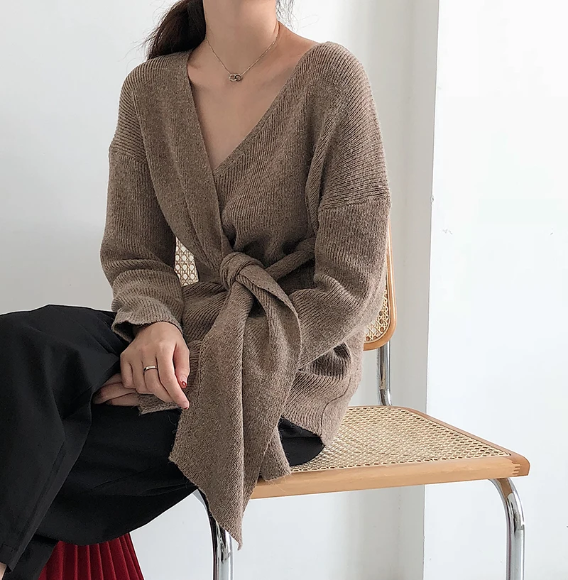 Женский свитер в Корейском стиле со шнуровкой на талии, женские свитера, однотонный необычный Sueter Mujer, повседневный вязаный свитер с v-образным вырезом, LJ345 Измерение: (Единица измерения: см)