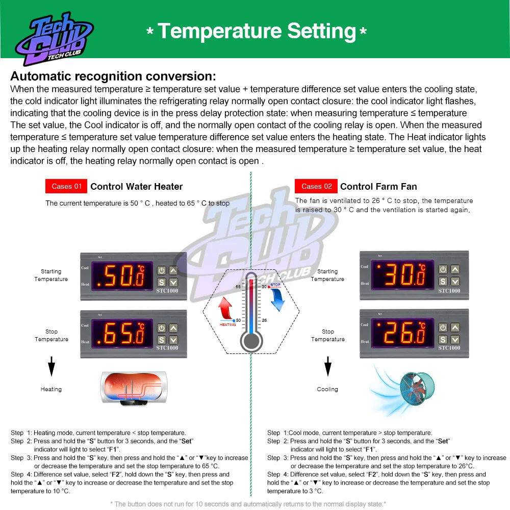 Сможете управлять температура и влажность в одно и то же время. Возможность подключения с увлажнителем и Осушитель оборудование в одно и то же время. Возможность подключения с холодильное оборудование/отопление и увлажнитель/Осушитель оборудование в одно и то же время. Функция обогрева/охлаждения может быть установлена отдельно для охлаждения и нагрева для защиты температурного контроллера от насильственного изменения. Такой же, как и влажности Управление. Поддержка калибровки температуры и влажности [Двойной Дисплей окна], чтобы иметь возможность Дисплей измеренная температура/Влажность и температура/влажность в одно и то же время Параметры: Модель: STC-3028 Вход напряжение: AC110 ~ 220V ± 10%, DC24V, DC12V Диапазон измерения температуры: -20 ° ~ + 80 ° Диапазон измерения влажности: 00% RH ~ + 100% RH Точность: ± 1 °, 0.1% RH Выходная контактная мощность реле: 10А/240В переменного тока Материал корпуса: поликарбонат + АБС-пластик огнеупорные Длина датчика: 1 м Настройка температуры запуска (влажности): Нажмите кнопку «вверх» один раз, чтобы отобразить исходную температуру (влажность). Нажмите кнопку «вверх» около 3 секунд, требуемая температура (влажность) может быть установлена кнопками вверх и вниз Установка стоп температуры (влажности): Нажмите кнопку «вниз» один раз, чтобы отобразить температуру остановки (влажность). Удерживайте кнопку в течение 3 секунд, и количество стоп-сигналов (влажности) мигает. Требуемая температура (влажность) может быть установлена кнопками вверх и вниз Температура/поправочный коэффициент на влажность: Пресс "вверх" и "вниз" Кнопка в одно и то же время. Посылка включает в себя: 1 х контроллер температуры и влажности