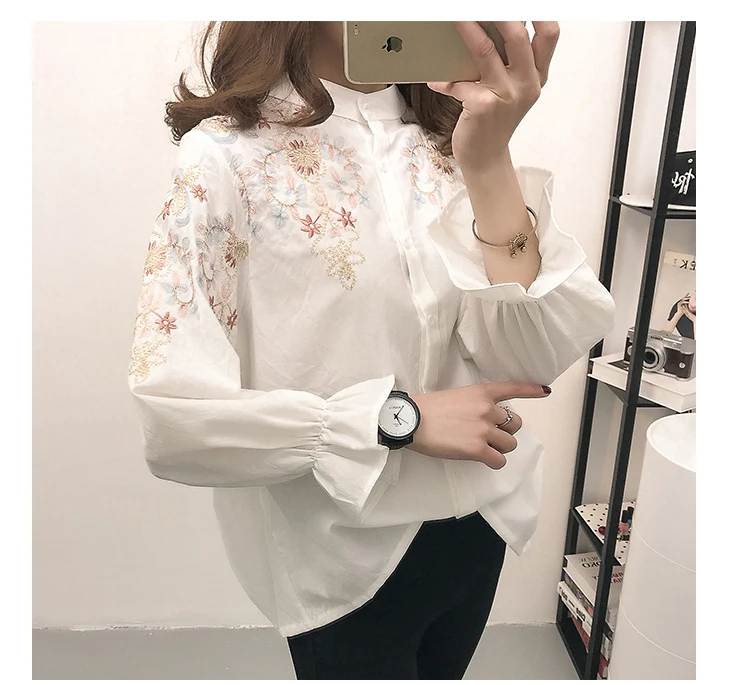 Korean Woman Blouse 2019 Long Lantern Sleeve Stand Collar Shirt Floral Embroidery Tops Fashion Causal Kawaii Blusas AF140