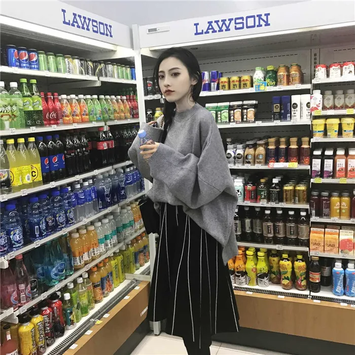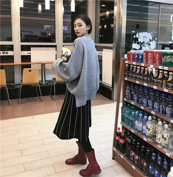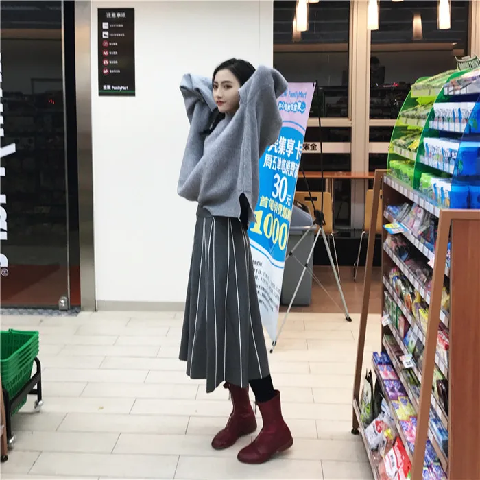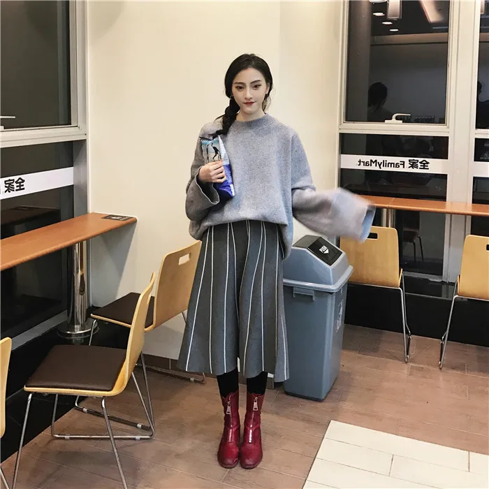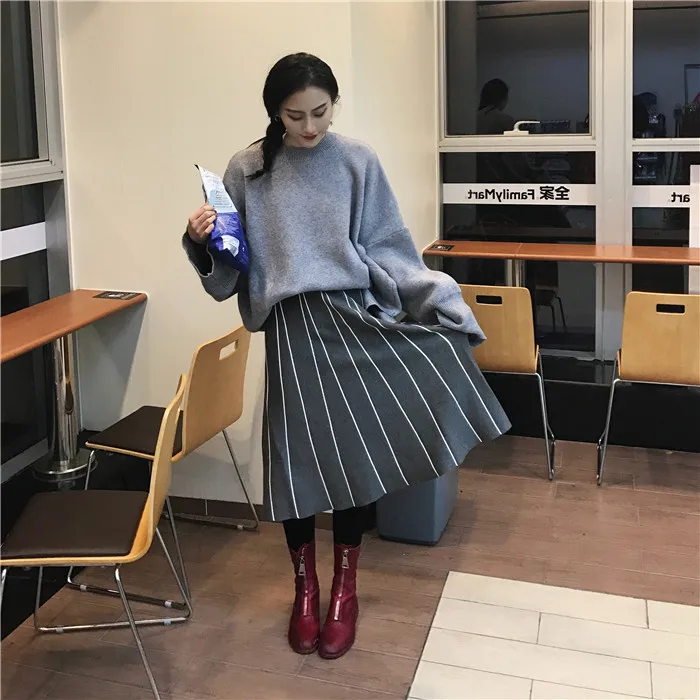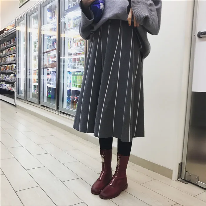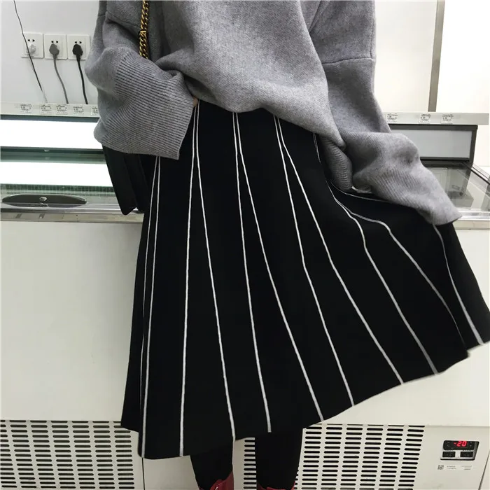 Юбки Женские зимние 2019 винтажные полосатые тонкие трапециевидные с высокой талией трикотажные длинные юбки Черные Серые юбка с бахромой DF998 <