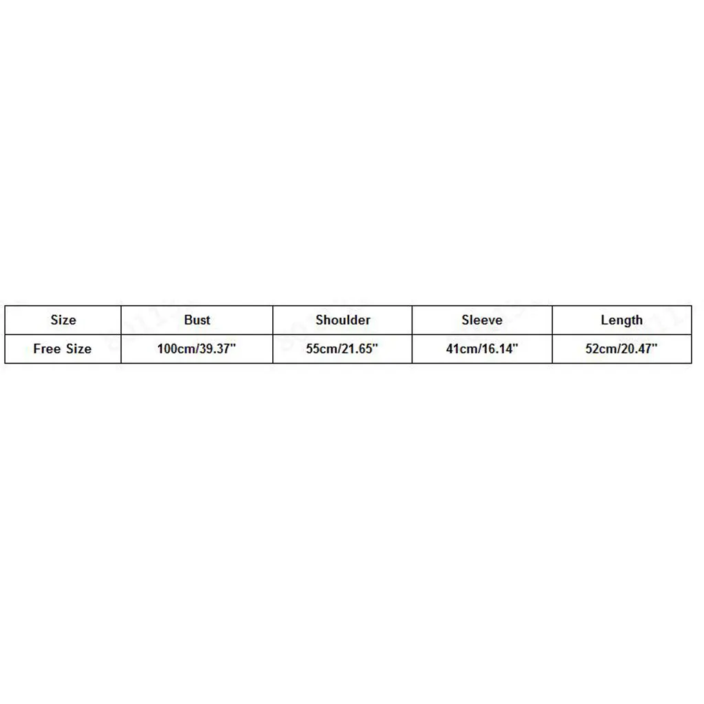 Size:Free SizeBust:100cm/39.37''Shoulder:55cm/21.65''Sleeve:41cm/16.14''Length:52cm/20.47''