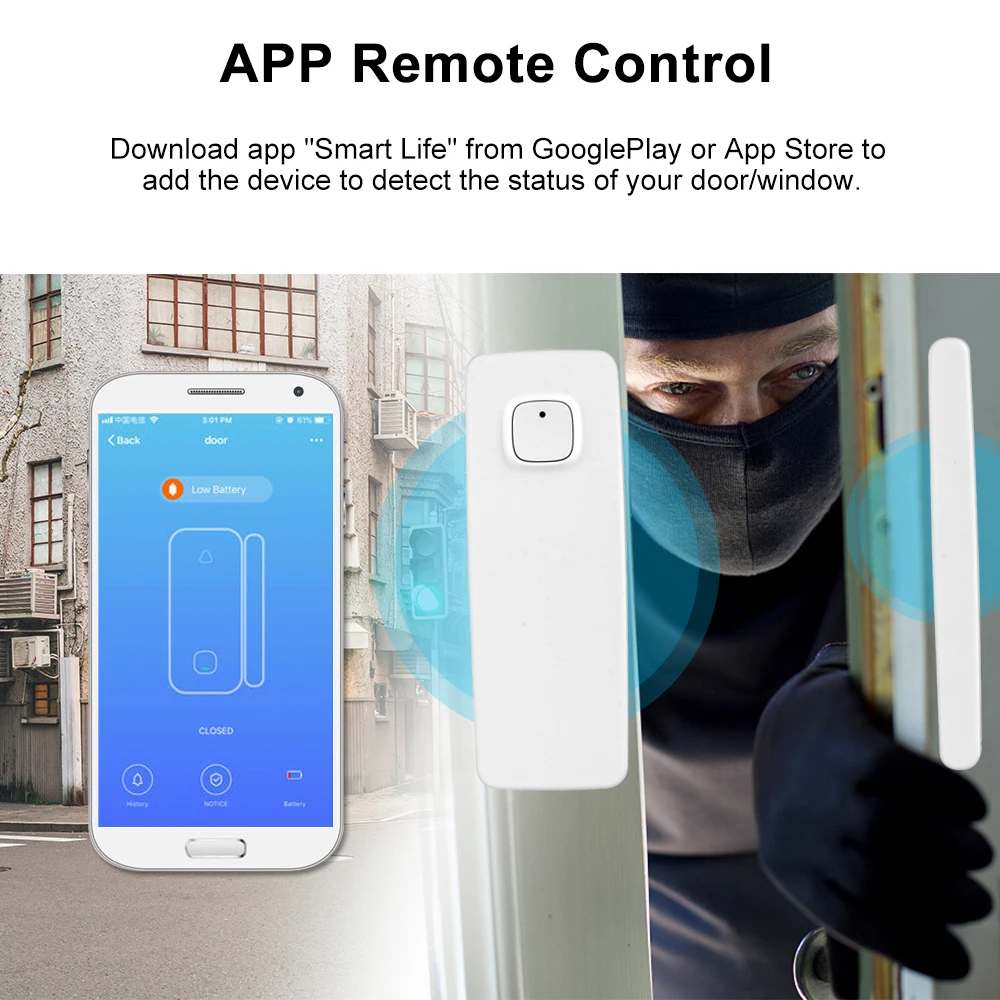[Пульт дистанционного управления APP]Загрузите приложение «Smart Life» или «Tuya» из магазина GooglePlay или app Store, чтобы добавить устройство для обнаружения состояния вашей двери/окна. Домашняя безопасность в вашей руке постоянно.