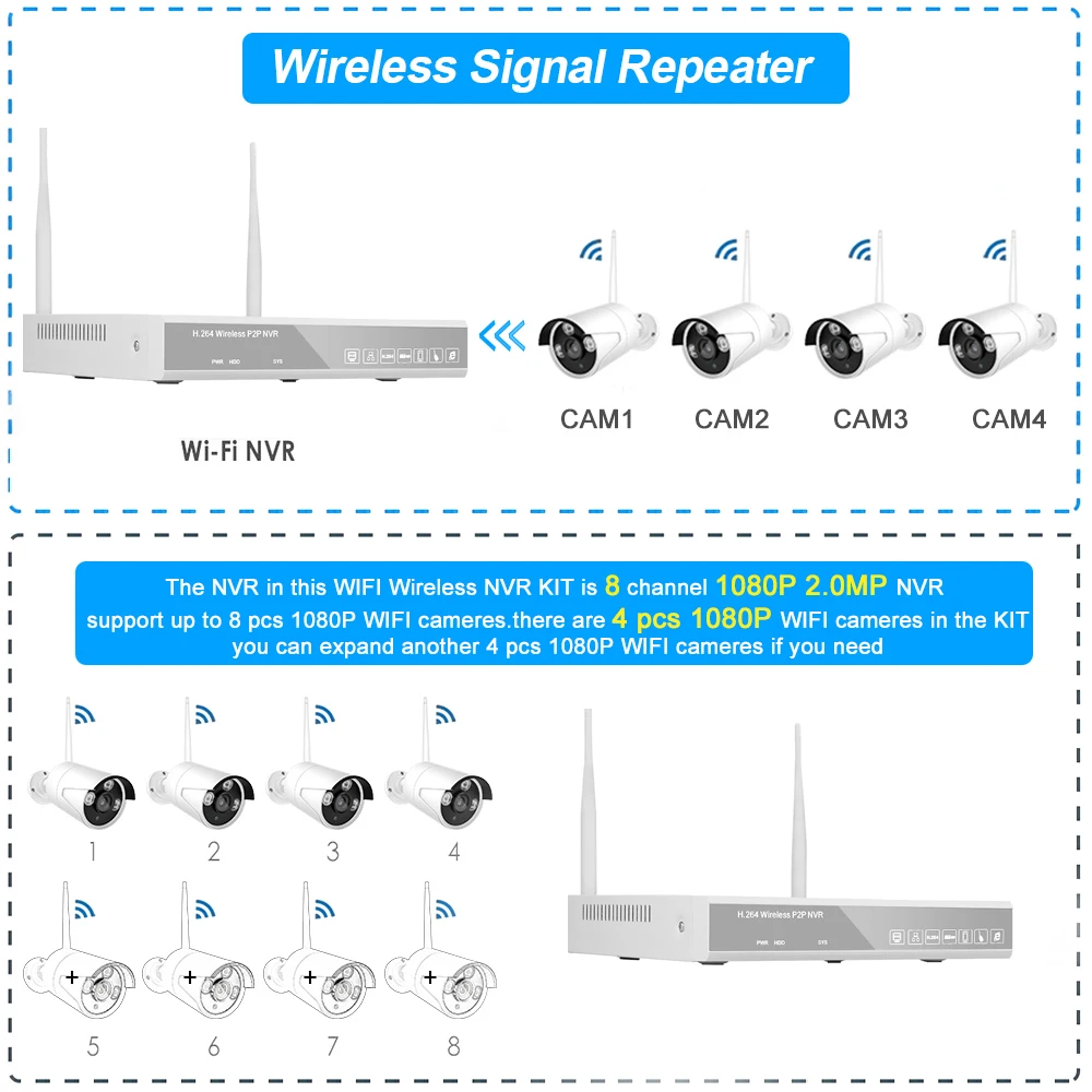 Есть 4 WIFI камеры 720P в комплекте, вы можете расширить еще 4 WIFI камеры 720P, если вам нужно.