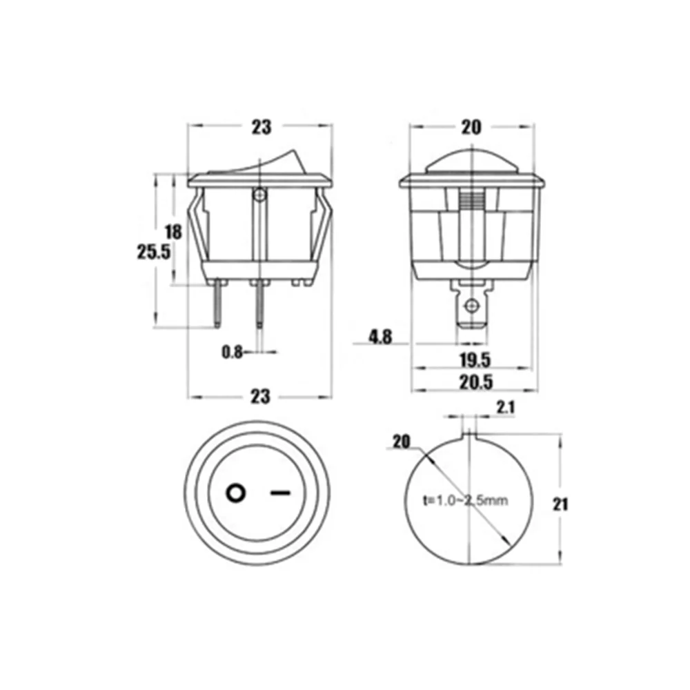 Полюсов: SPST Положение: ВКЛ-ВЫКЛ 2 позиции Действий Тип: С механической блокировкой Напряжение/ток: 250 В переменного тока/6A 125 В/10A Количество клемм: 2p Материал: пластик, металл Размеры: 25x30 мм/0,9 "x 1,18" (макс. D * H) Монтажное отверстие Диаметр: 20 мм/0,79" Цвет: белый, красный, черный