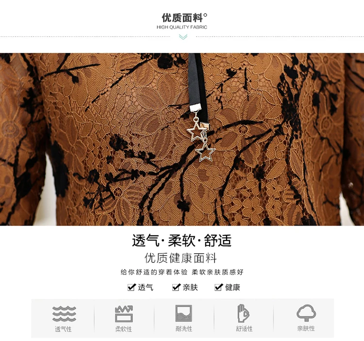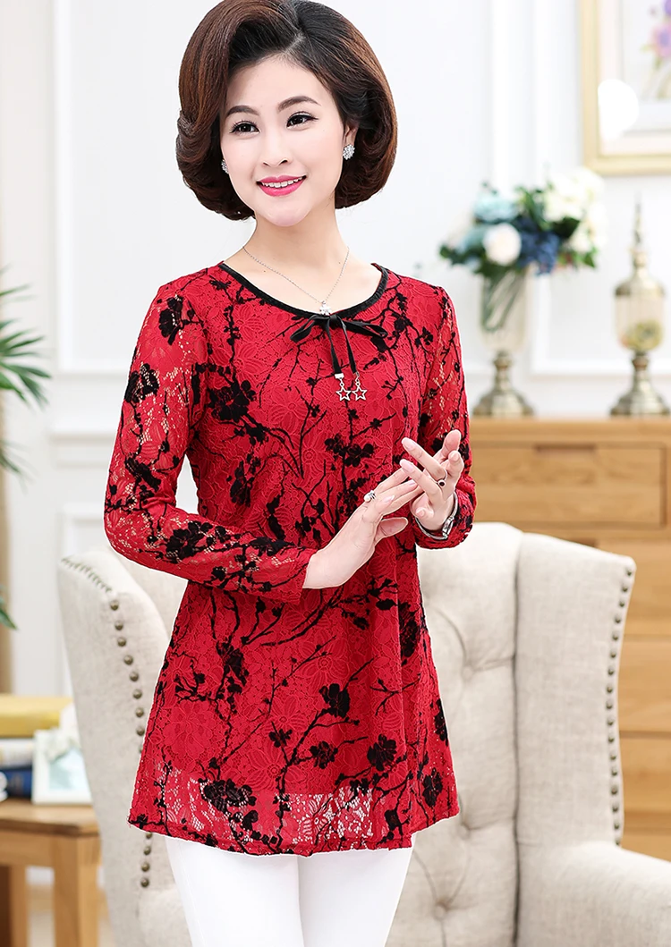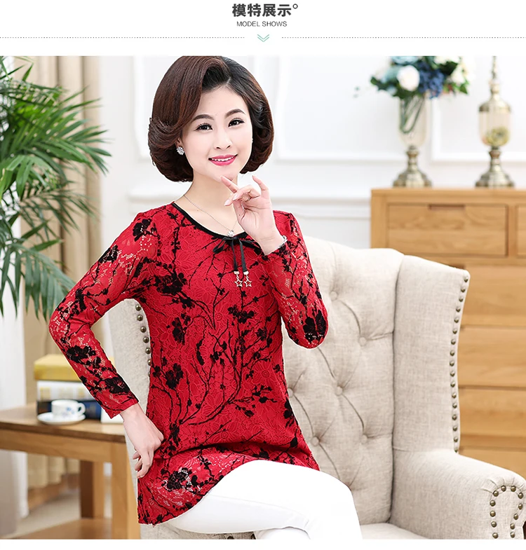 Кружевная футболка с длинными рукавами, новинка весны 2019, для мамы среднего возраста, плюс размер, женский топ с принтом, нижняя рубашка пулловеры DV502