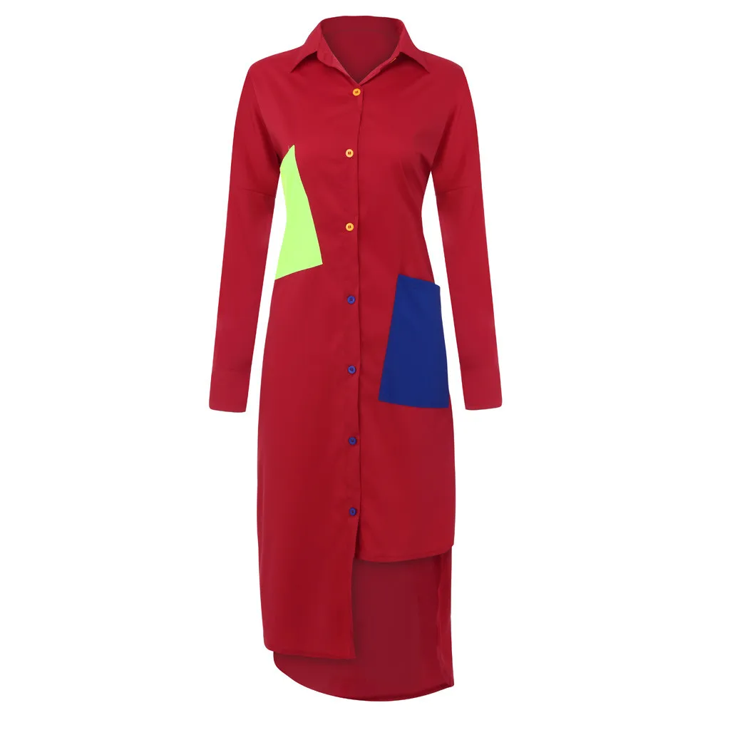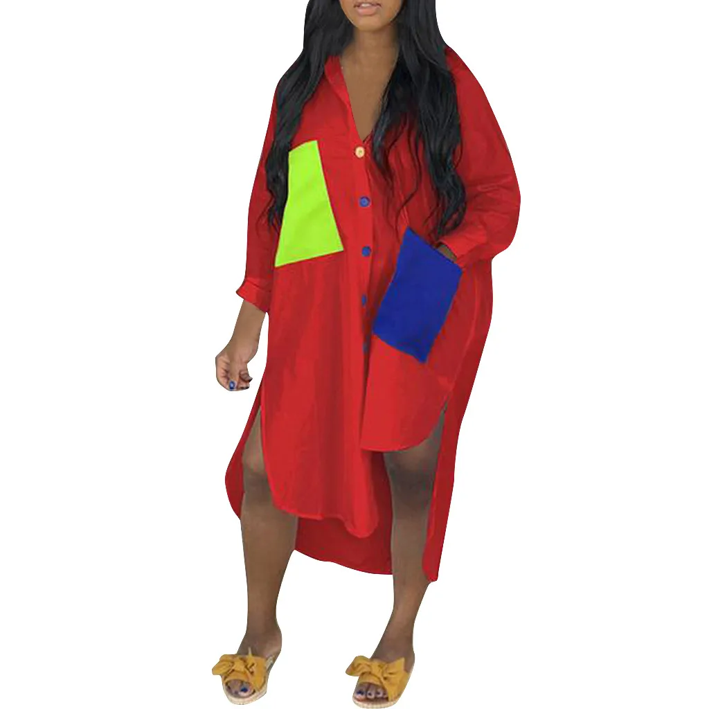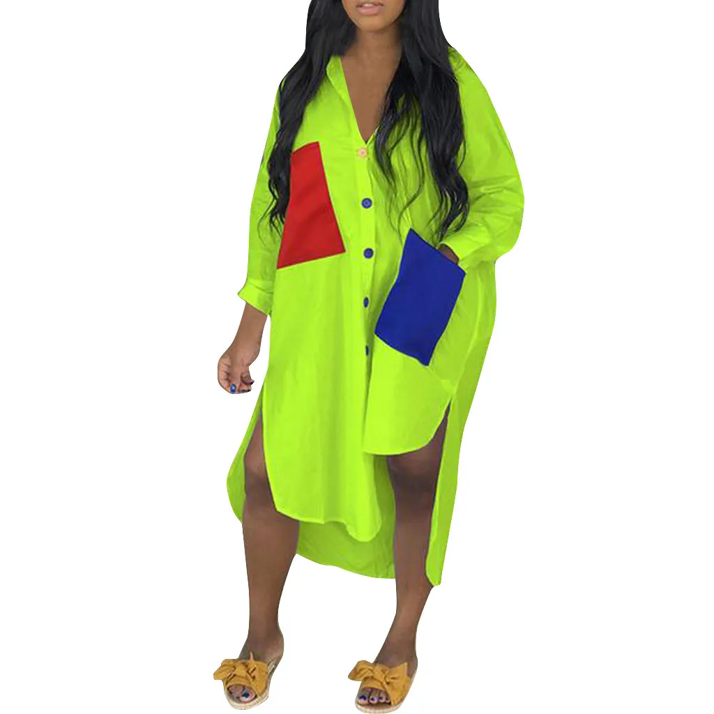 Женское модное платье-футболка с длинными рукавами и отложным воротником и карманом на пуговицах