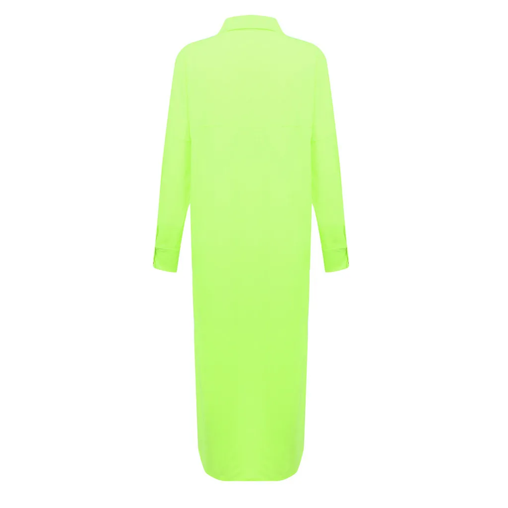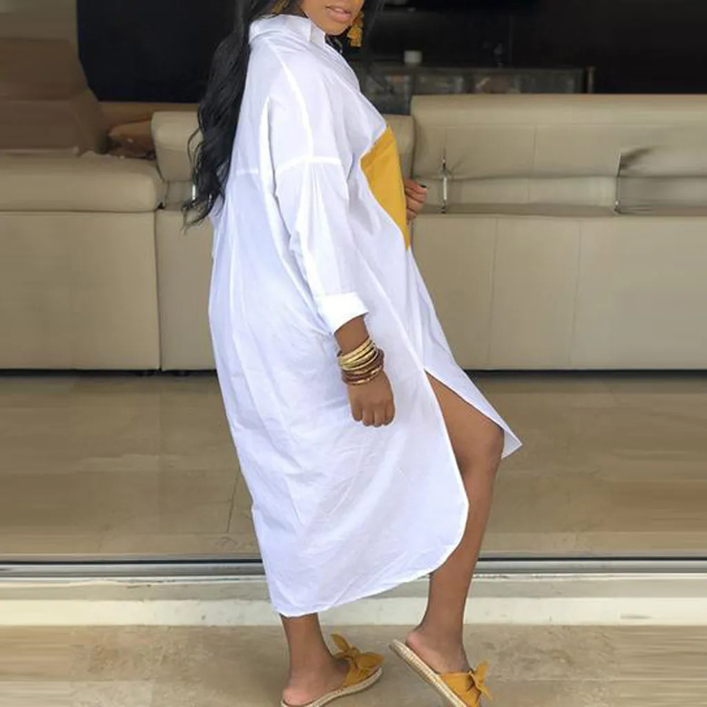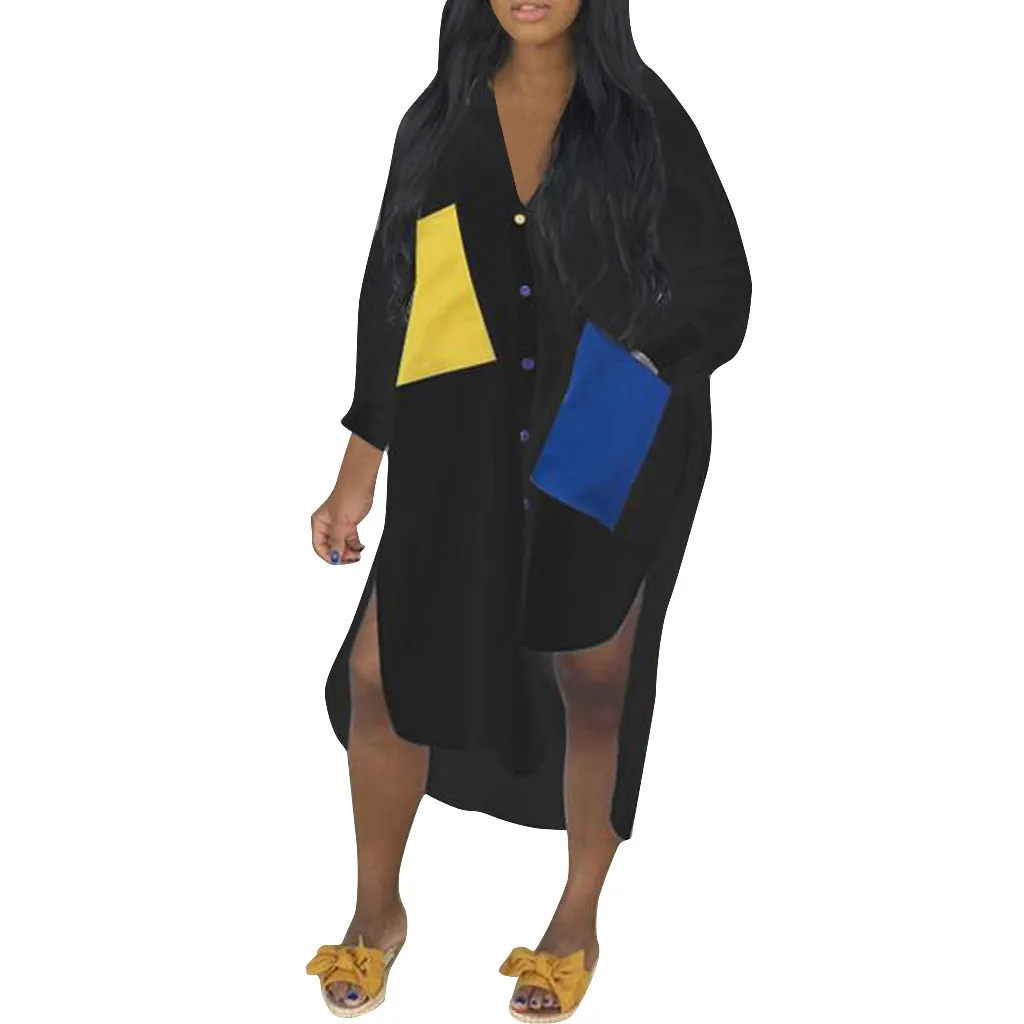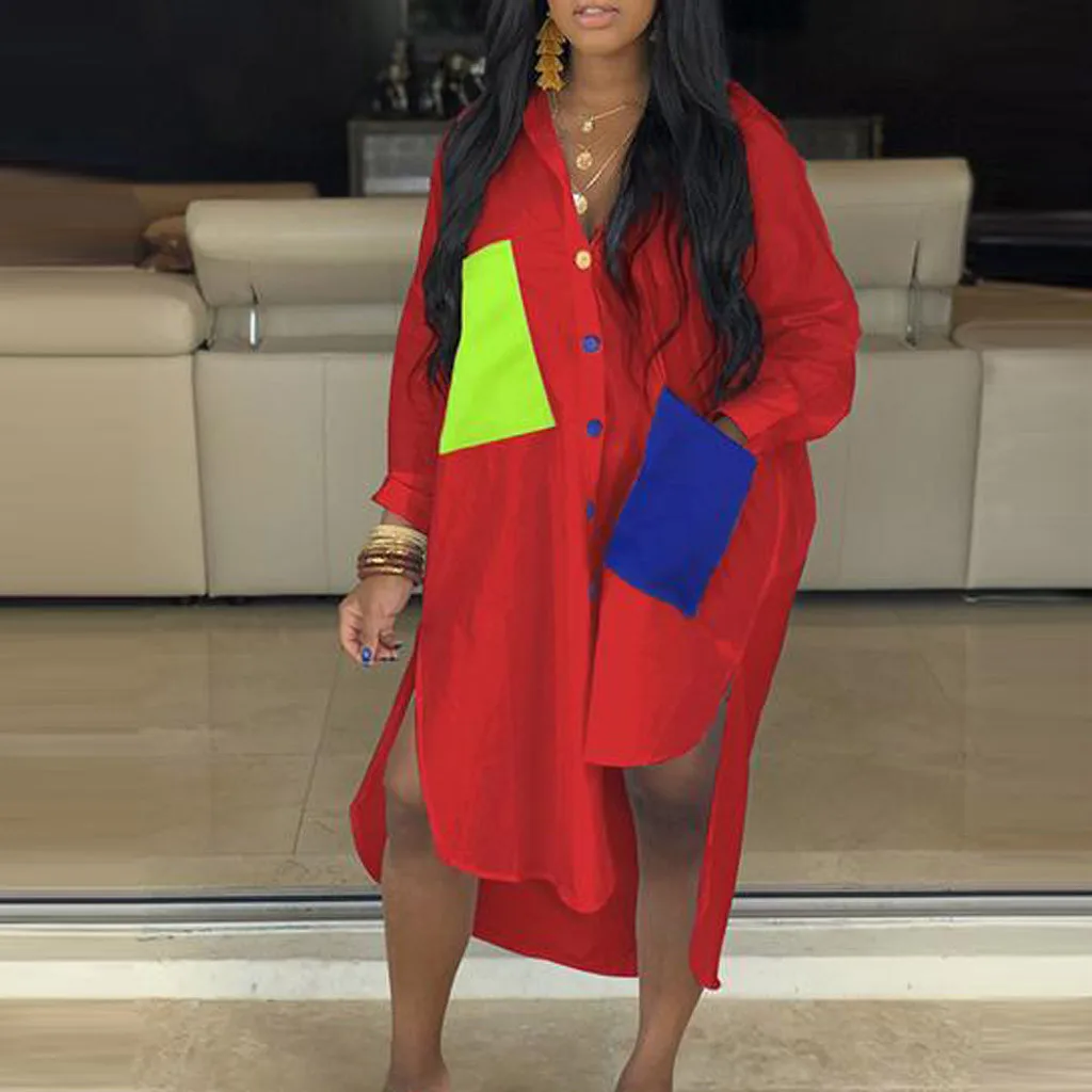 Женское модное платье-футболка с длинными рукавами и отложным воротником и карманом на пуговицах