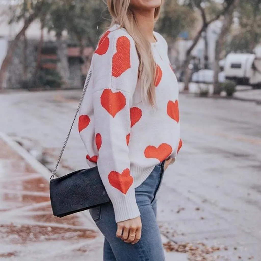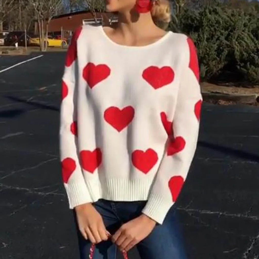 Женский свитер с круглым вырезом, пуловер с длинным рукавом, трикотажный топ в форме сердца, блузка