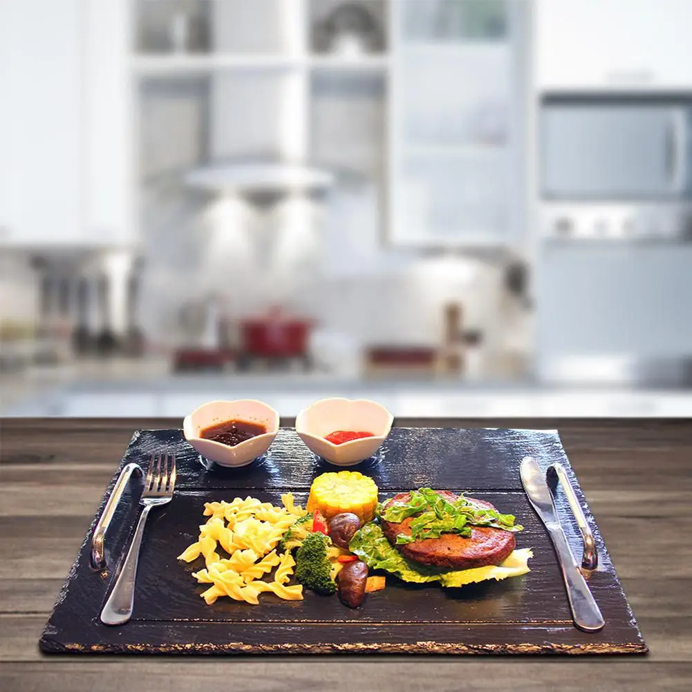 1. Широкое Хранение: хорошая тарелка с хорошим подносом, который является элегантным и шикарным. Поднос изготовлен из цинкового сплава, специально разработан для хранения соуса для стейка, вина и салата.1 * сланцевый лоток