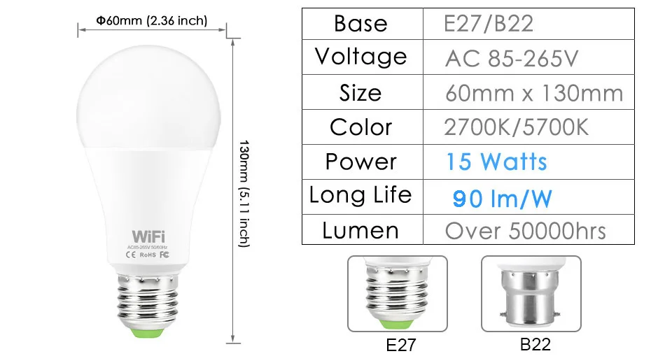 Спецификация:Тип: WiFi смарт-светодиодный светильникМатериал: авиационный алюминий, пластикЦвет изделия: белыйФункция: Управление WiFi, Совместимость с Amazon Alexa Echo Google Home AssistantСветильник Цвет: теплый белый (2700K) /белый (5700K)Тип разъема: E27 / B22Мощность: 15 ВтНапряжение: 85-265 В переменного токаЧип: светодиодный SMD 2835CRI: >85Люмен: 90 лм/ВтСрок службы: >100000 чУгол луча: 270 градусовРазмеры: 6*12,3 cm/2,4*4,8 "(L * H)Чистая Вес: 68g/2,4 oz1. Голосовое управление:Простое Голосовое управление всеми лампами smart светильник с помощью интеграции с Amazon Alexa Echo или Google Home Assistant, это включает в себя включение/выключение, яркость. Ex, вы можете сказать, "Alexa переключает мой умный светильник на 50 процентов". Не требуется ни ступицы, ни моста!2. Контроль времени:Никогда не Возвращайтесь домой в темный дом-используя светильник в приложении и получайте теплый светильник. Функция таймера позволяет автоматически включать и выключать умный светодиодный светильник.3. Дистанционное и групповое управление:Держите подключив этот Wi-Fi умный светильник лампочка с вашей домашней сети (поддерживает только 2,4 ГГц Wi-Fi), вы можете удаленно Контролируйте умный Светильник лампы на вашем смартфоне имитации в тех случаях, когда вы выходите из дома, В доме есть люди. Функция группового управления позволяет управлять более чем одной умной лампой-светильник одновременно для настройки сцены.