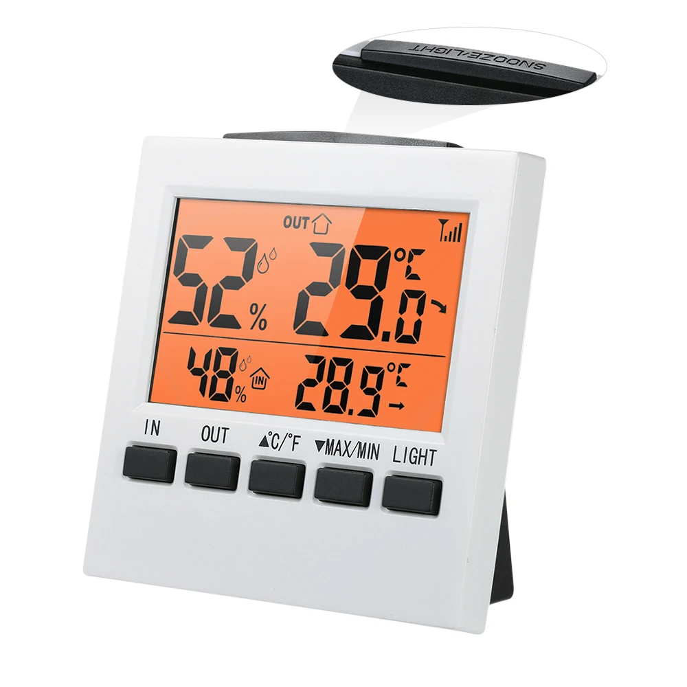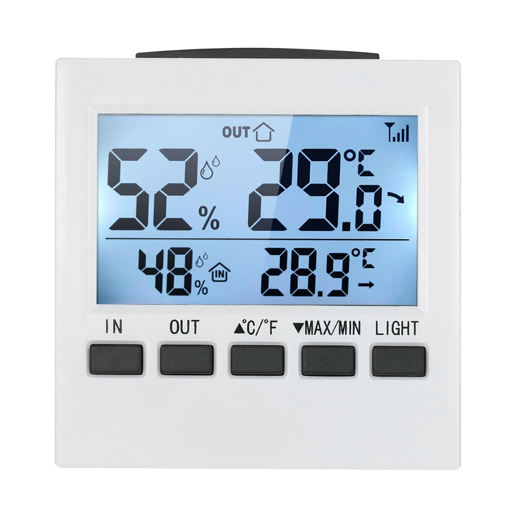 Этот мини-цифровой измеритель влажности, который может отображать температуру в помещении и на улице и влажность одновременно, отлично подходит для домашнего использования, теплицы, склада и фермы. Большой ЖК-дисплей с подсветкой, вы можете легко прочитать значение. Точное измерение температуры и влажности в помещении и на улице.