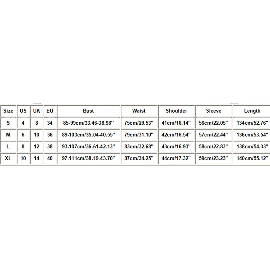 Что вы получаете: 1 женское платье РазмерСШАВеликобританияЕСБюстТалияПлечоРукавДлинаS483485-99 см/33,46-38,98''75 см/29,53''41 см/16,14''56 см/22,05''134 см/52,76''М6103689-103 см/35,04-40,55''79 см/31,10''42 см/16,54''57 см/22,44''136 см/53,54''L8123893-107 см/36,61-42,13 дюйма83 см/32,68''43 см/16,93''58 см/22,83''138 см/54,33''XL10144097-111 см/38,19-43,70''87 см/34,25''44 см/17,32''59 см/23,23''140 см/55,12''