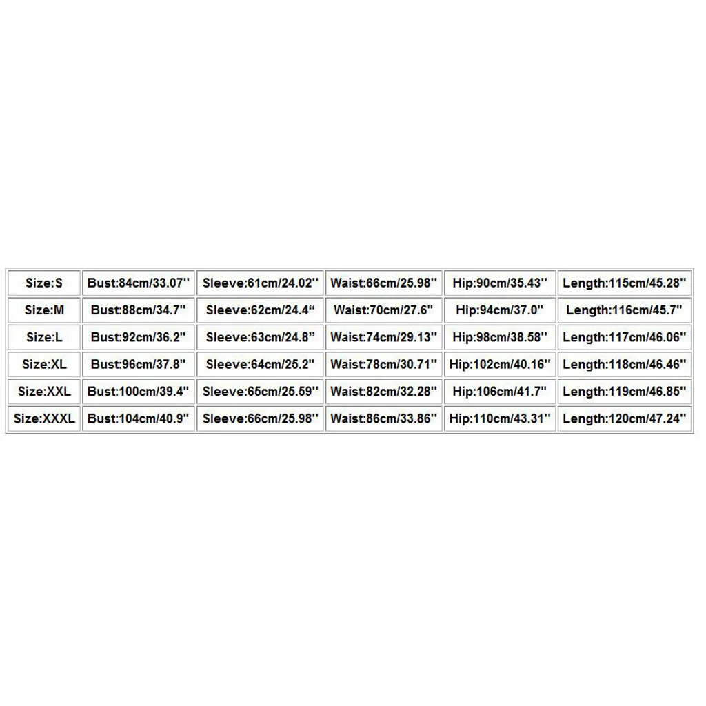 Размер: SОбхват груди: 84 см/33,07 дюймаРукав: 61 см/24,02 дюймаТалия: 66 см/25,98 дюймаОбхват бедер: 90 см/35,43 дюймаДлина: 115 см/45,28 дюймаРазмер: MБюст: 88 см/34,7"Рукав: 62 см/24,4 дюймаТалия: 70 см/27,6"Обхват бедер: 94 см/37,0 дюймаДлина: 116 см/45,7"Размер: LБюст: 92 см/36,2"Рукав: 63 см/24,8 дюймаТалия: 74 см/29,13 дюймаОбхват бедер: 98 см/38,58 дюймаДлина: 117 см/46,06''Размер: XLБюст: 96 см/37,8"Рукав: 64 см/25,2"Талия: 78 см/30,71 дюймаОбхват бедер: 102 см/40,16 дюймаДлина: 118 см/46,46''Размер: XXLБюст: 100 см/39,4"Рукав: 65 см/25,59 дюймаТалия: 82 см/32,28 дюймаОбхват бедер: 106 см/41,7 дюймаДлина: 119 см/46,85 дюймаРазмер: XXXLБюст: 104 см/40,9"Рукав: 66 см/25,98 дюймаТалия: 86 см/33,86 дюймаОбхват бедер: 110 см/43,31 дюймаДлина: 120 см/47,24''