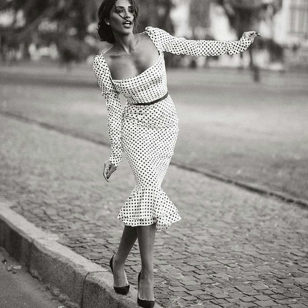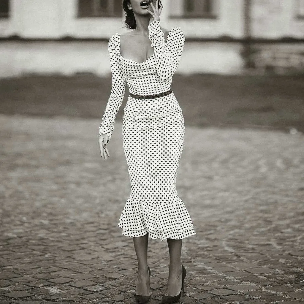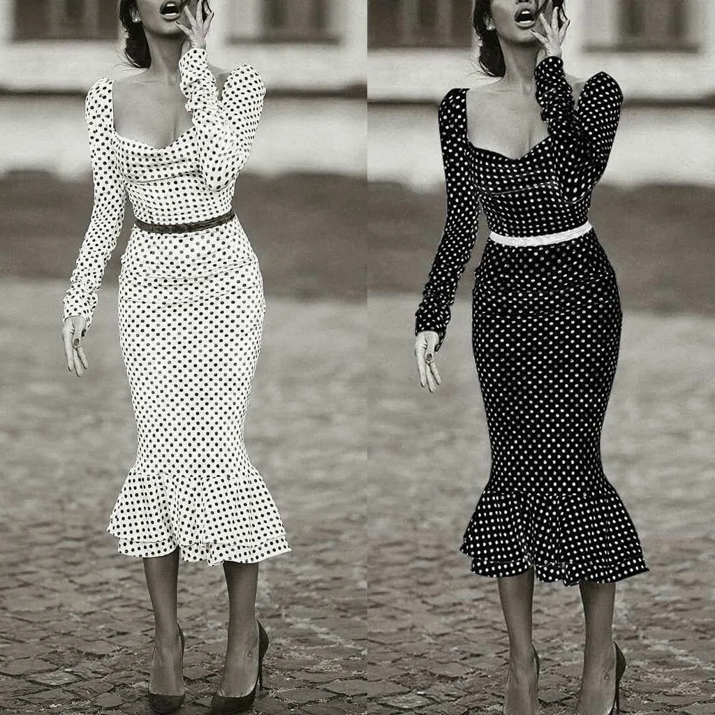 Женское облегающее платье с длинным рукавом и квадратным воротником в горошек, коктейльное платье для выпускного вечера