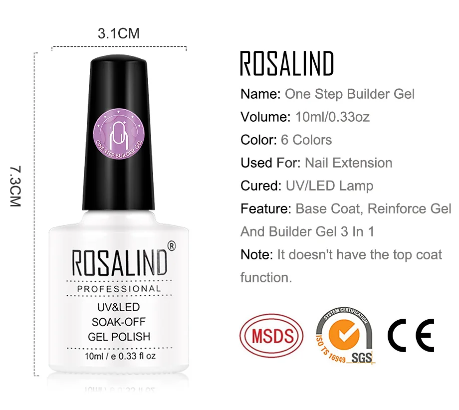 Бренд: ROSALIND Название: One Step Builder ОБЪЕМ ГЕЛЯ: 10 мл Цвет: 6 цветов Характеристика: Базовое покрытие, усиленный гель и быстрый конструктор 3 в 1 Примечание: У него нет функции верхней части пальто.