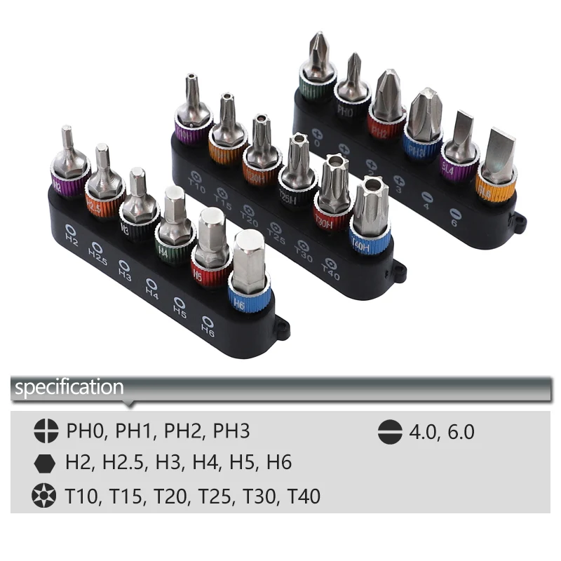 Головка отвертки изготовлена из хромованадиевой легированной стали, всего 19 шт., тип имеет шлицевые, phillips, torx и шестигранные, каждый тип имеет несколько размеров
