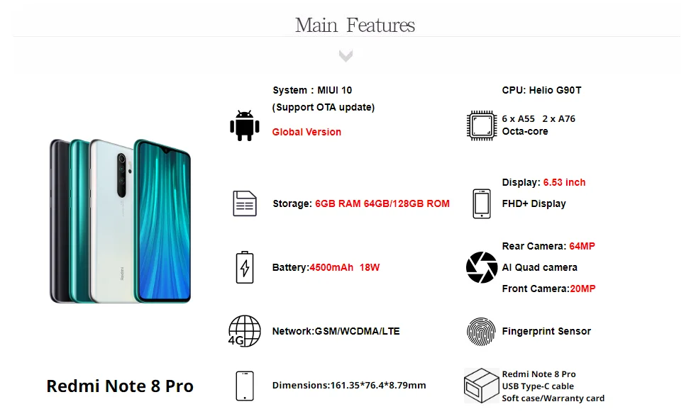 Оригинальный Redmi Note 8 Pro, 6 ГБ ОЗУ, 64 Гб ПЗУ, 64 мп, четыре камеры MTK Helio G90T, смартфон, 4500 мАч, 18 Вт, QC 3,0, UFS 2,1, NFC