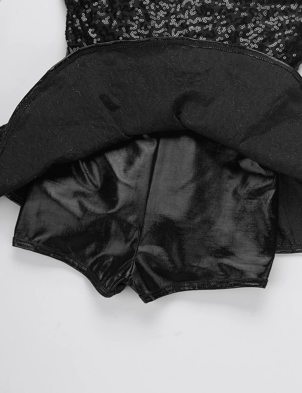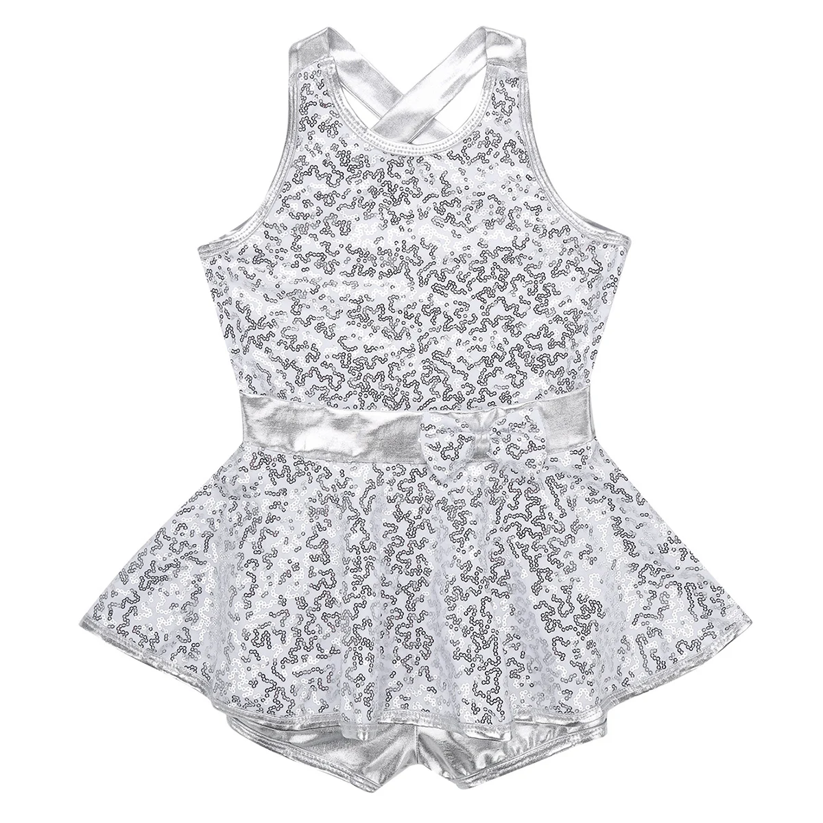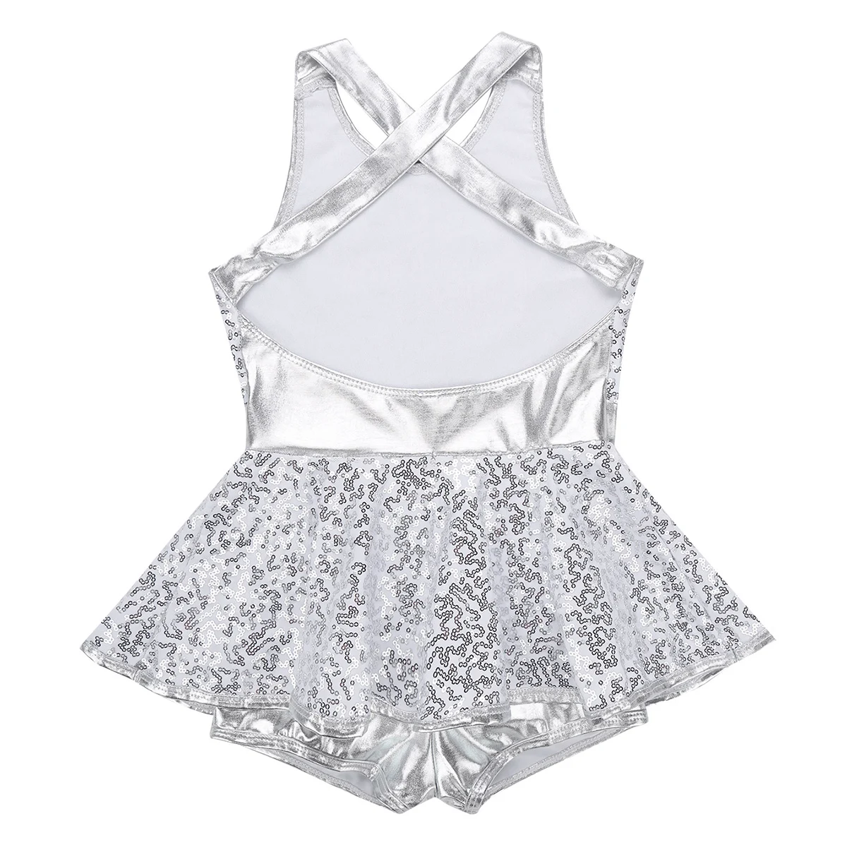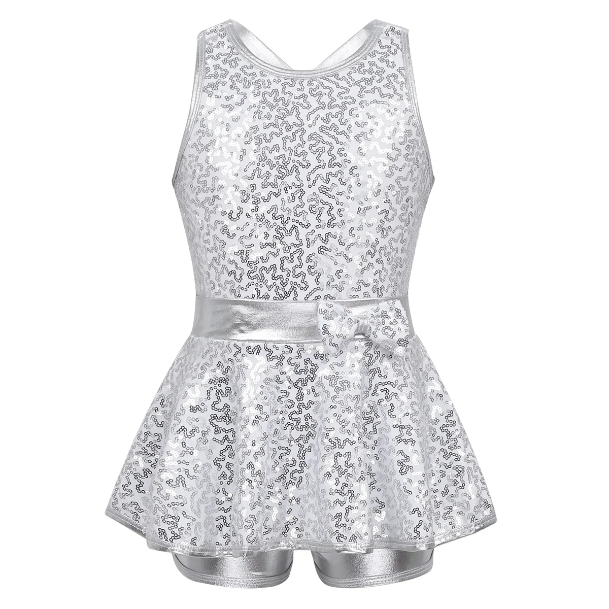 Однослойная юбка с баской и пайетками на талии. Встроенный шорты с металлическим отливом. Стильная, красивая и блестящая Одежда для танцев для вашей девочки.