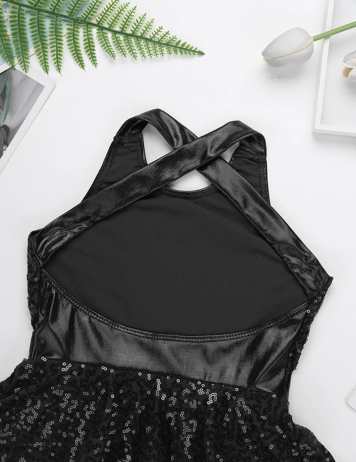 Без рукавов, круглый вырез, открытая спина с перекрещивающимися бретелями. Топ с лифом украшен блестящими пайетками. Прошитый бант на талии.