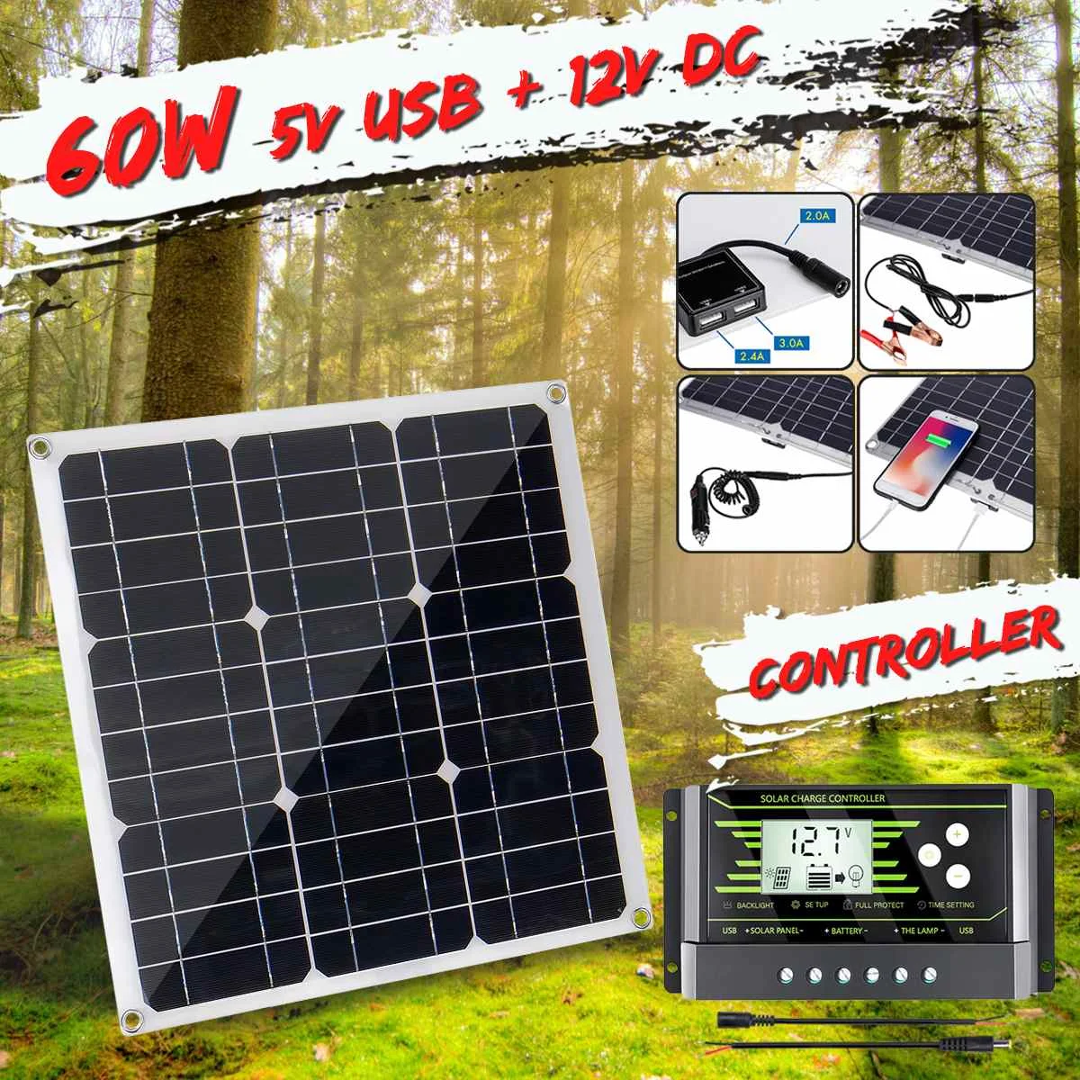 Монокристаллическая солнечная панель, 60 Вт, 18 в, двойная 12 В/5 В постоянного тока, USB, монокристаллическое гибкое солнечное зарядное устройство для автомобиля, RV, лодки, зарядное устройство + 10A 12 В/24 В ШИМ-контроллер