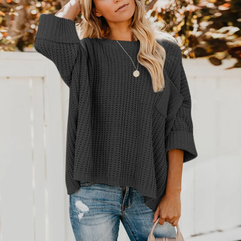 Женский модный однотонный Повседневный вязаный свитер с открытыми плечами и карманами