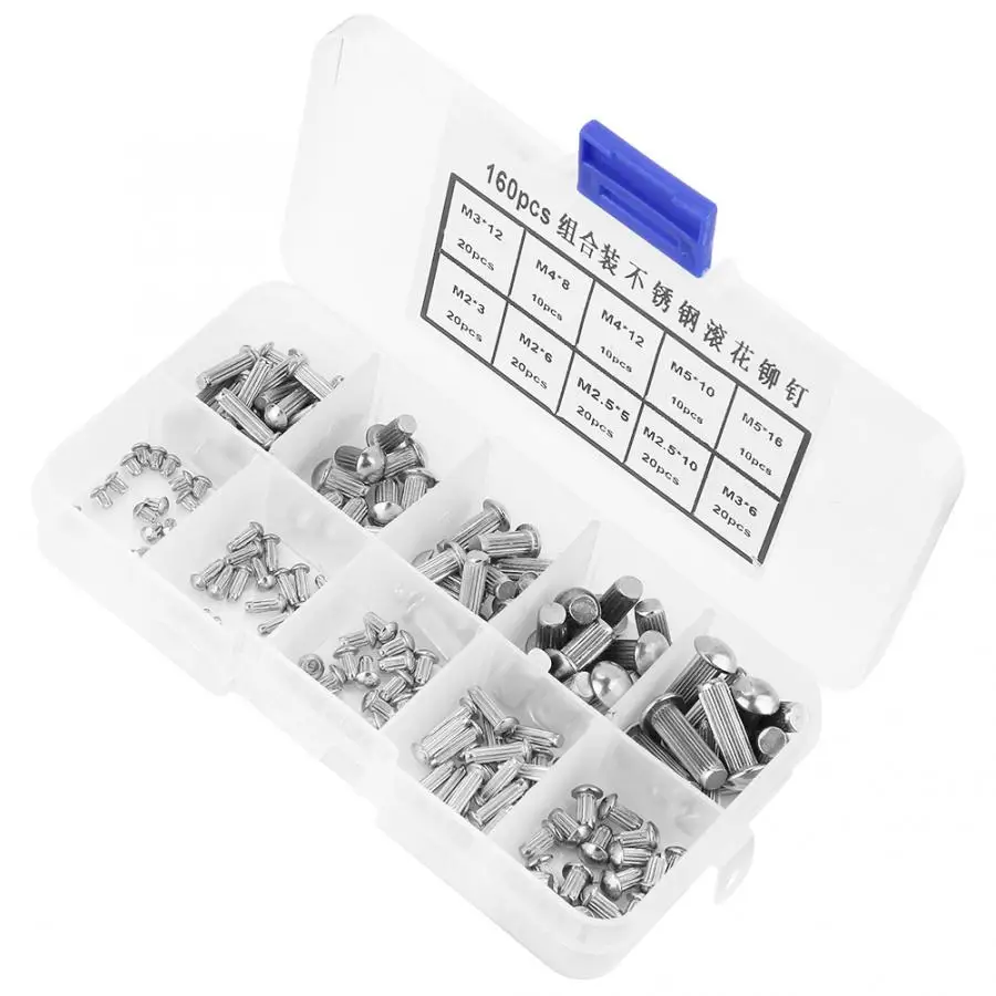 160Pcs M2-M5 Rivets Round Head Solid Knurled Shank Rivet Stainless Steel Rivet Nuts Set with Box Assortment Kit Round Head Rivet