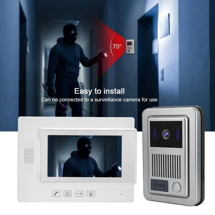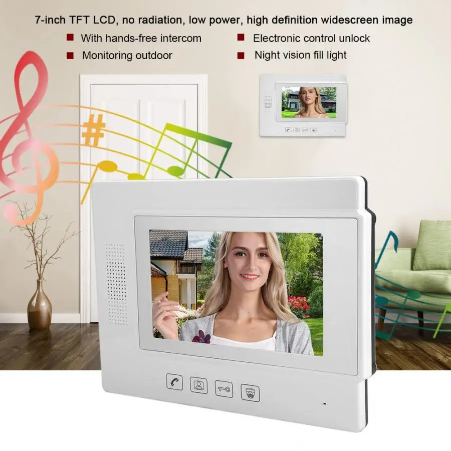 Environmentally friendly, durable, non-toxic, tasteless, impact resistant, low temperature resistant. Screen 800x480 resolution, original TFT-LCD, 7-inch digital LCD screen, HD quality, mirror elements, touch screen buttons. Alloy and ABS material, waterproof and dust-proof, durable, professional audio, SDP noise reduction, night view fill light, use card to open door. HD camera auto-sensing, microphone, hi-fi speaker, doorbell button. With a 700-line camera, the image is clear. Hands-free intercom, electronically controlled unlocking, monitoring the door. The color display, ringtone, and intercom volume can be adjusted. There are 8 polyphonic ringtones on the display that can be switched freely. It can be connected to a surveillance camera for use. Easy to install.