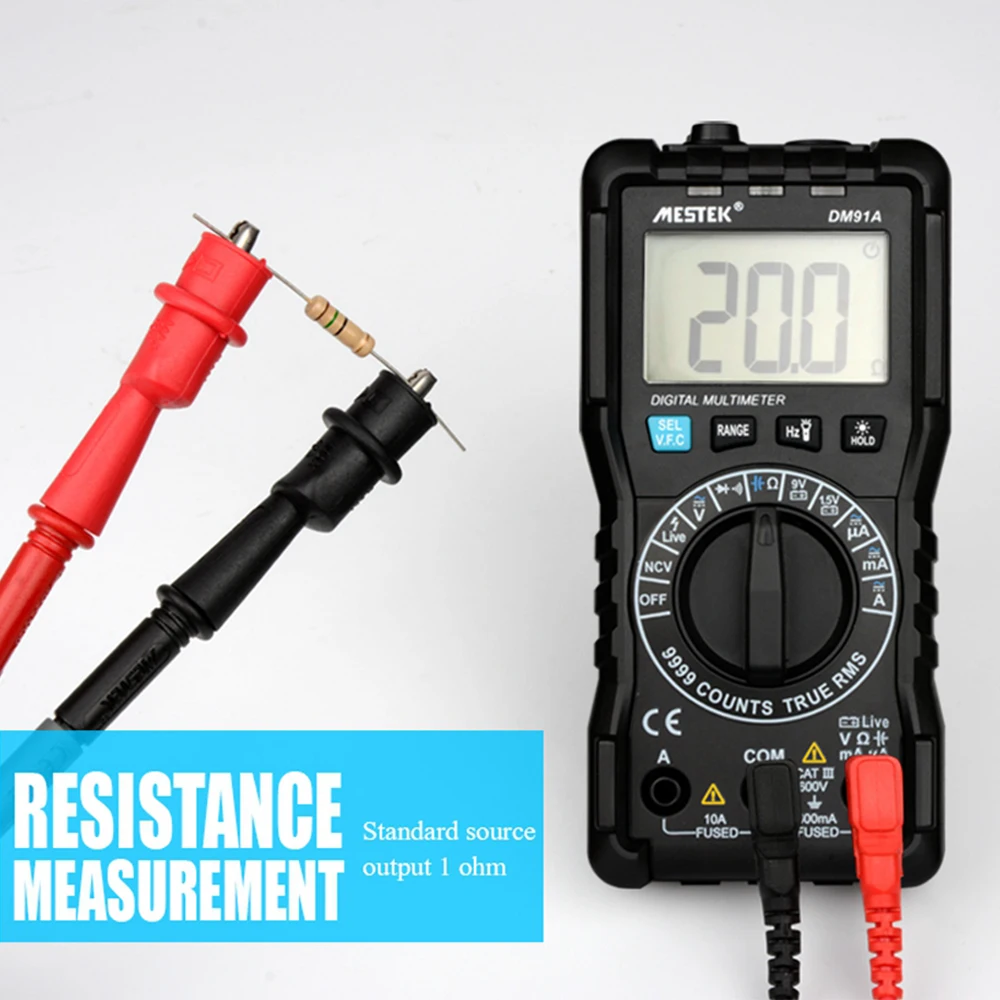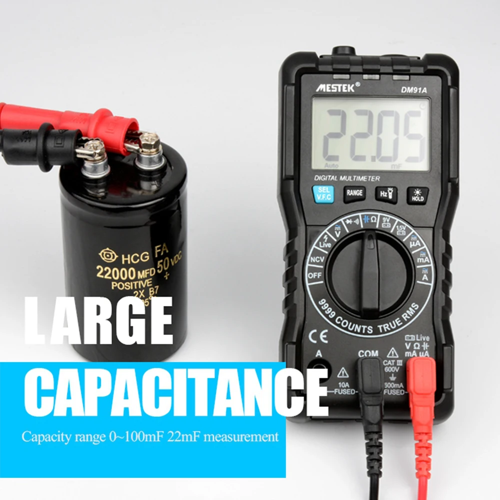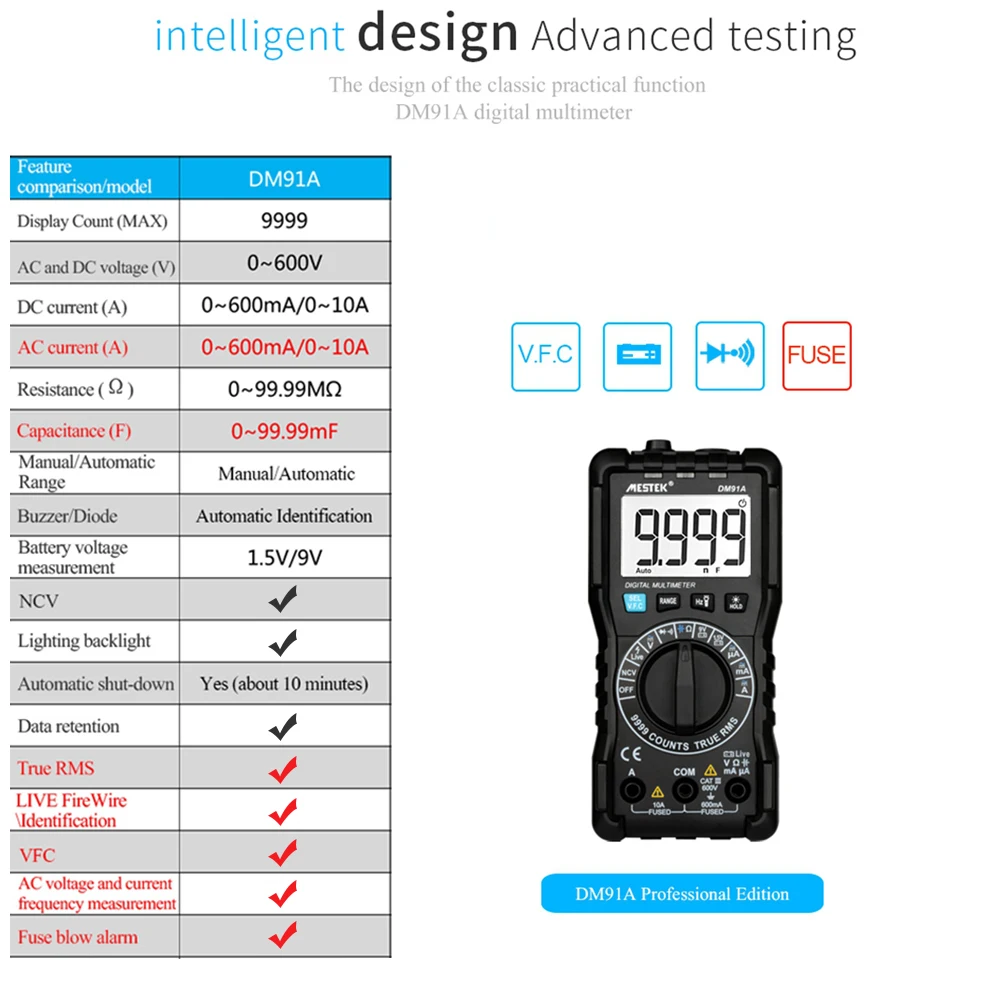 9999 отсчетов и многофункциональный-может отображать 9999 подсчетов и тестировать AC/DC напряжение/ток, диод, сопротивление, емкость, ACНапряжение тока Частотный тест, непрерывность, тест в режиме реального времени и NCV с предохранителем плавкий сигнал тревоги.