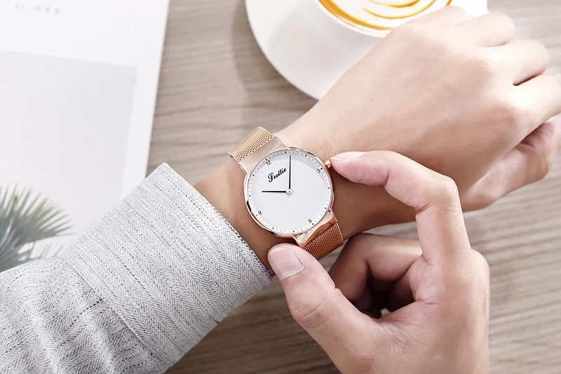 Простой минималистичный дизайн с тонким сетчатым ремешком из нержавеющей стали, качественный японский механизм + круглый чехол с IP покрытием из розового золота.